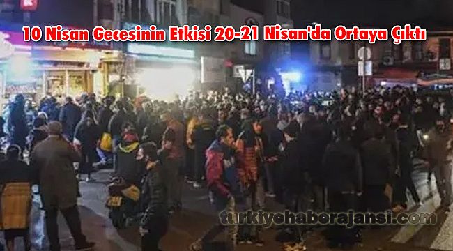 20-21 Nisan'da yükselen vaka artışlarının 10 Nisan gecesinden kaynaklandığı belirtildi.Türkiye'de koronavirüs tedbirleri kapsamında ilk sokağa çıkma yasağı 10 Nisan-12 Nisan arasında uygulanmıştı.Gece yarısına 2 saat kala ilan edilen sokağa çıkma yasağı öncesinde vatandaşlar, fırın ve bakkallara akın etmiş, sosyal mesafenin hiçe sayıldığı görüntüler ortaya çıkmıştı.10 Nisan gecesi ortaya çıkan görüntüler tartışma konusu olmuş ve bu durumun etkisinin ilerleyen günlerde çıkacağı belirtilirken uzmanlar o gece dışarı çıkanların kendisini 14 gün karantinaya almasını istemişti.ETKİSİ 20-21 NİSAN'DA ORTAYA ÇIKTIMilliyet'ten Mert İnan'ın haberine göre; 19 Nisan’da 3 bin 977’i olan yeni vaka sayısı, 20 Nisan’da bir anda 4 bin 674’e çıktı.21 Nisan tarihinde ise vaka artış hızı yüzde 5.1 olurken, günlük vaka sayısı de 19 Nisan’a göre 634 kişi arttı. Uzmanlar bu artışın, 10 Nisan etkisinden kaynaklandığını belirtti.