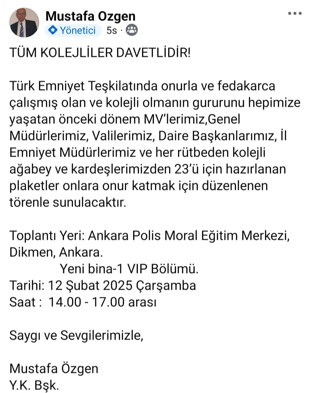 Polis Koleji Mezunlar (PKM) Derneği Başkanı Mustafa Özgen, Türk Emniyet teşkilatında onurla ve fedakarca çalışmış olan önceki dönem milletvekilleri, Emniyet Genel Müdürleri, Valiler, EGM Daire Başkanları, İl Emniyet Müdürleri ile her rütbeden kolejlilere onur katmak için düzenlenecek törenle plaket takdim edileceğini paylaştı.Plaket takdim töreni Ankara Dikmen Polis Eğitim Merkezi yeni bina -1 VİP bölümünde 12 Şubat Çarşamba günü 14.00 ile 17.00 saat aralığında gerçekleştirilecek.