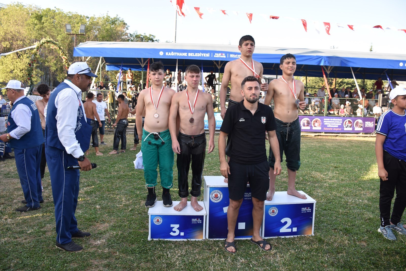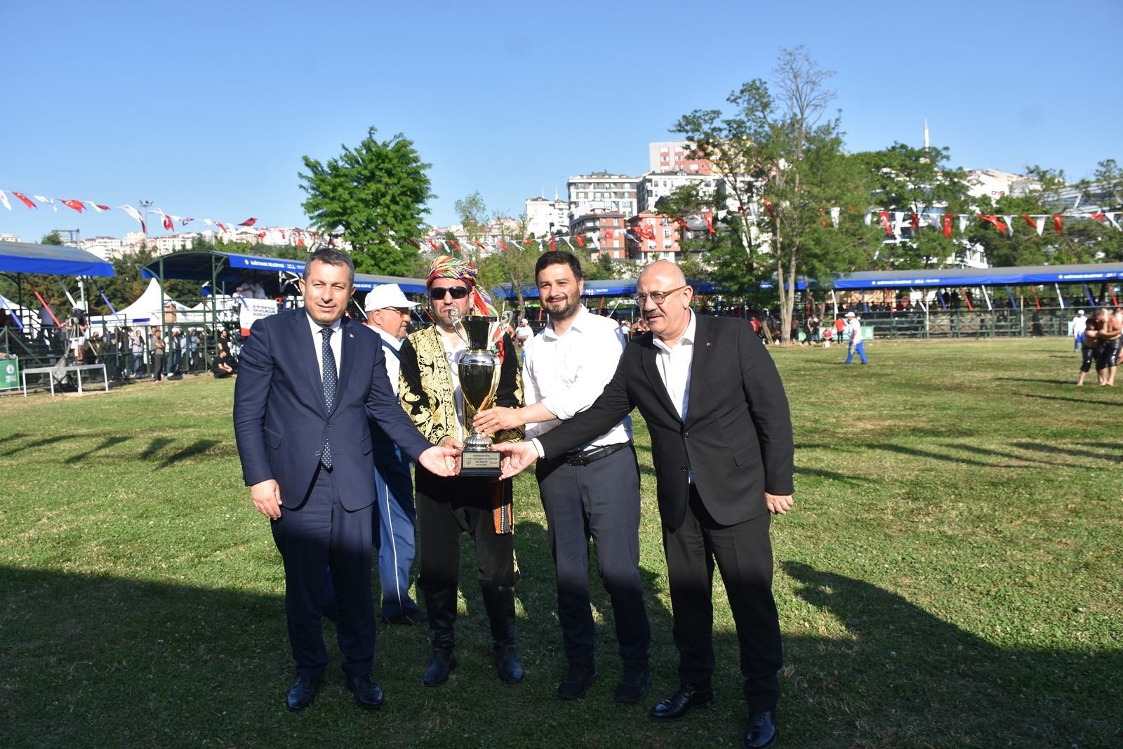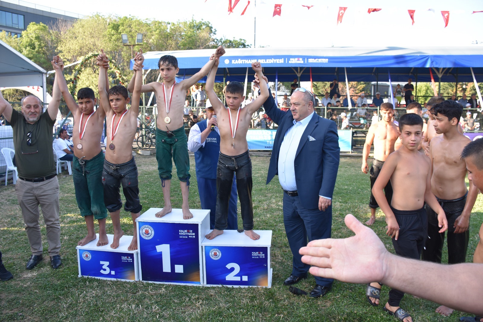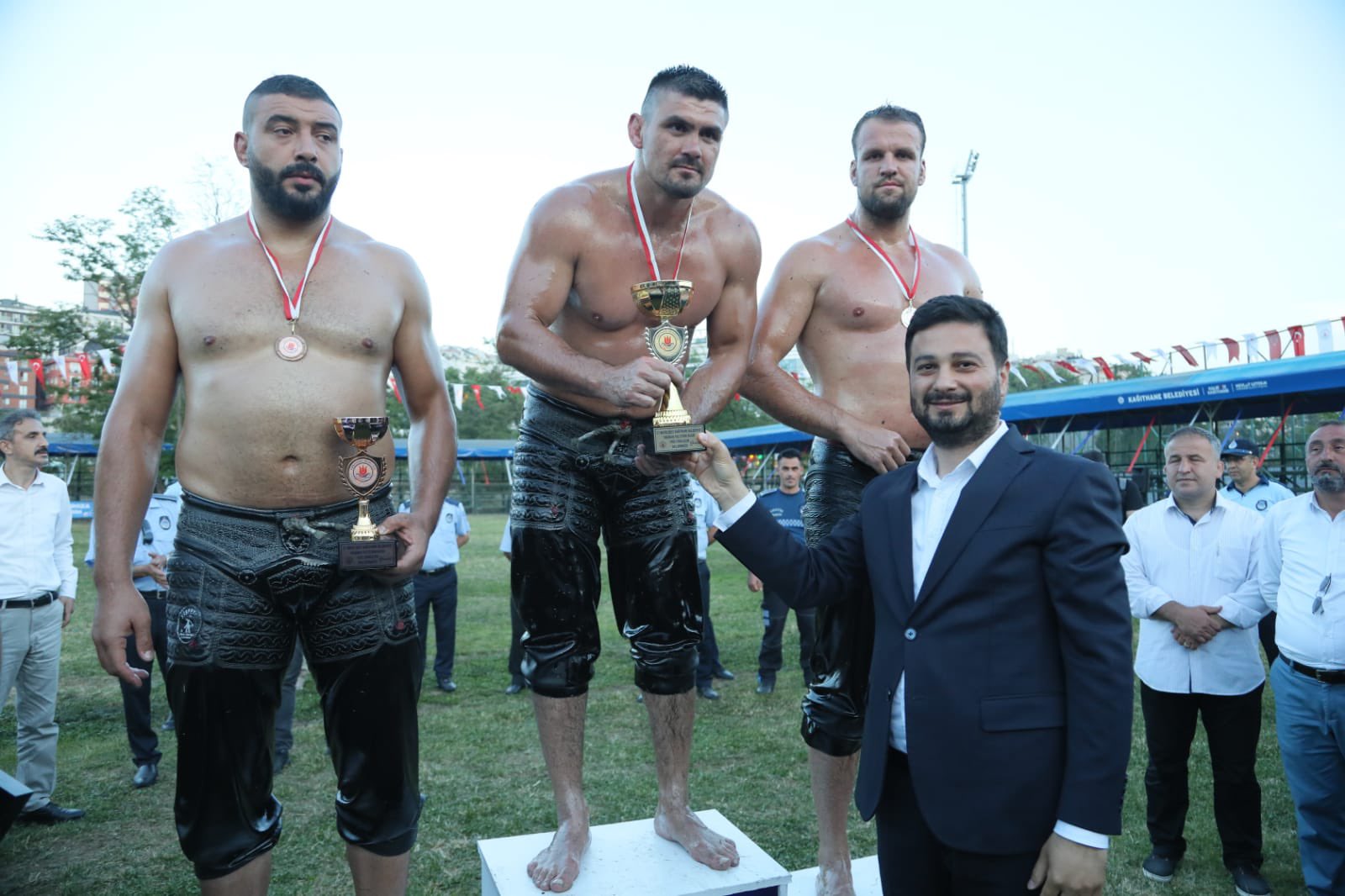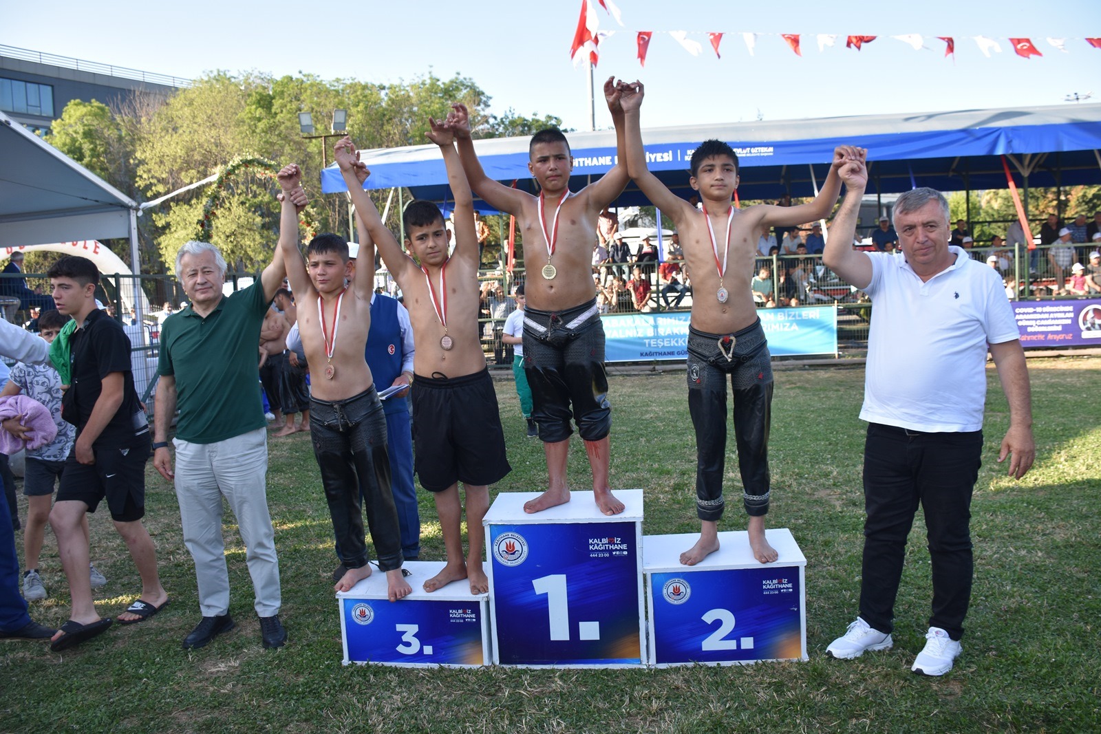 29. Kağıthane Yağlı Güreşlerinin başpehlivanlık kürsüsü; birinci Faruk Akkoyun, ikinci Hüseyin Gümüşalan, üçüncüler Ali Gürbüz ve Menderes Saltık’tan oluştu.