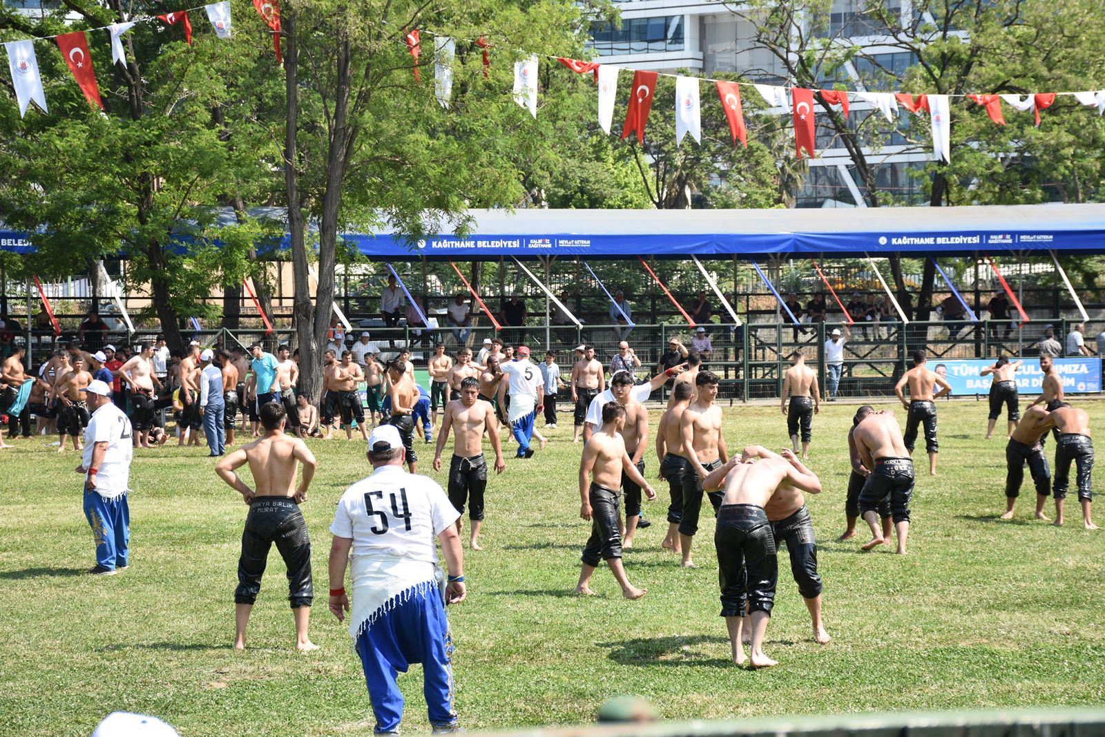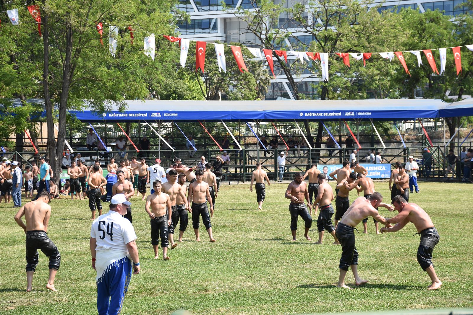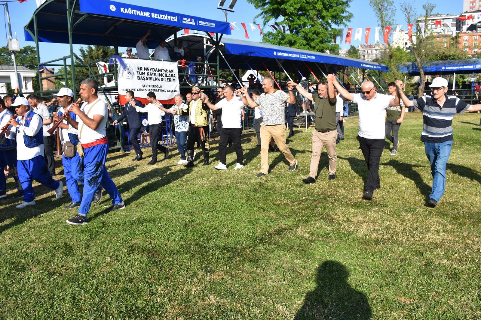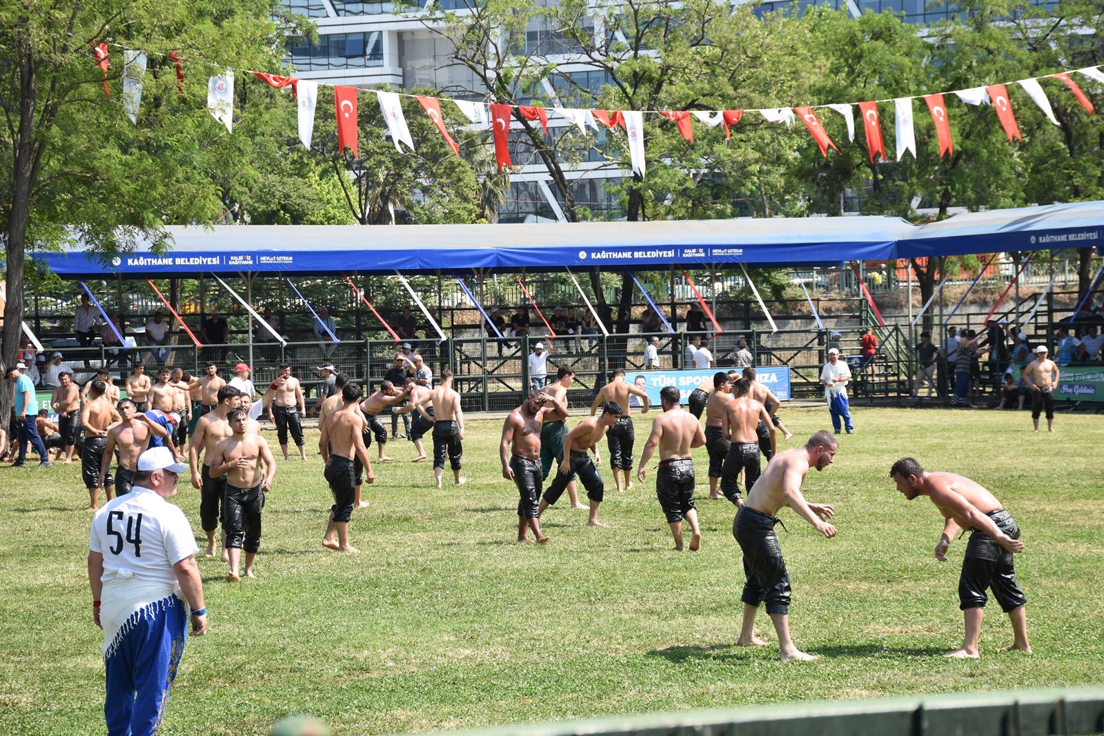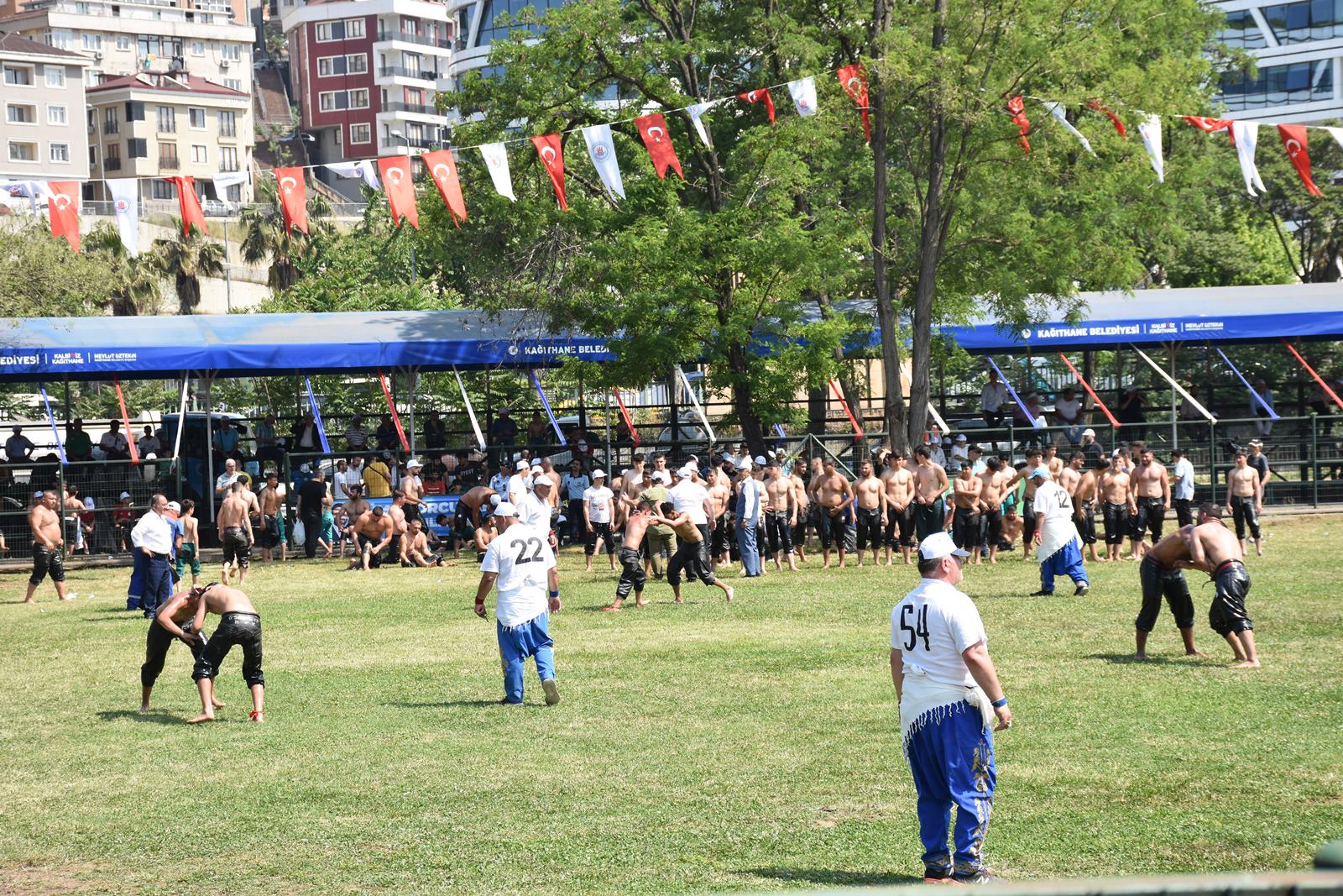 Kağıthane Belediye Başkanı Mevlüt Öztekin’in ev sahipliğinde düzenlenen yağlı güreş festivaline AK Parti İstanbul Milletvekili Hasan Turan, Kağıthane Kaymakamı Tahir Şahin, İstanbul Gençlik ve Spor İl Müdürü Prof. Dr. Burhanettin Hacıcaferoğlu, yurdun dört bir yanından önceki dönem şampiyonları, Ağaları, pehlivanlar ve Kağıthaneliler katıldı.