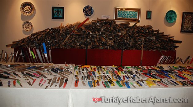 İstanbul Anadolu Adalet Sarayı girişindeki aramalarda güvenlik görevlileri tarafından son 6 ayda yakalanan kesici ve delici suç aletleri ile vatandaşların adli emanette unuttuğu eşyalar sergilendi.Adalet Sarayı'ndaki Şehit Mehmet Selim Kiraz Sergi Salonu'nda gerçekleştirilen sergide, adliyenin giriş noktalarında buluna X-Ray cihazı ile tespit edilen, güvenlik görevlilerinin yaptığı aramalarda veya otopark girişinde arabaların içinde ele geçirilen suç aletlerinin yanı sıra, vatandaşların adli emanete bıraktığı malzemeler yer aldı.Yaklaşık 7 bin 500 parça eşyanın yer aldığı sergide, bin 391 sopa ve benzeri suç aleti, 978 makas, 934 çakı, 435 biber gazı, 60 şiş ve 399 inşaat malzemesi bulunuyor.Sergilenenler arasında şok cihazı, granit spirali, kazma, kürek, balta, keser, çatal, elektrik veren saç maşası, kredi kartı görünümünde bıçak, çırpma teli gibi ilginç malzemeler de bulunurken, adliyeye gelen araçlarda yapılan aramalarda ele geçirilen sopalardaki "hakyemez", "ağrı kesici" ve "cennetten çıkma" gibi yazılar dikkati çekiyor."KABAPÇIDAN DAHA ÇOK ŞİŞ VAR"Basın mensuplarına açıklama yapan İstanbul Anadolu Cumhuriyet Başsavcısı Fehmi Tosun, suç eşyalarının son 6 ayda adliyeye gelen vatandaşların güvenlik kontrolü sırasında ele geçirildiğini söyledi.Bu eşyaların hepsinin suç eşyası olmadığını belirten Tosun, "Sizlerin de gördüğü gibi ele geçirilen şişler, tamamıyla suç işlemek için, birilerine zarar vermek maksadıyla, sopalar da muhtemel bir kavga ve kargaşa anında kullanıp başkalarına zarar vermek maksadıyla bulundurulan aletler. Bıçakların, kesici delici aletlerin, şok cihazlarının amacı bu." dedi.Başsavcı Fehmi Tosun, daha sonra sergi alanını gezdi. Tosun, basın mensuplarına suç aletlerinin ne amaçla kullanıldığını anlatırken, "Vatandaşın çantasında böyle testere olur mu? 'İnşaata gidecektim yanlışlıkla adliyeye geldim' mi diyecek? Görüyorsunuz çok sayıda şiş var. Kebapçıdan daha çok şiş var." şeklinde espriler yaptı.