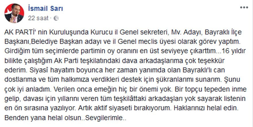 “16 yıldır birlikte çalıştığım AK Parti teşkilatındaki dava arkadaşlarıma çok teşekkür ederim. Siyasi hayatım boyunca her zaman yanımda olan Bayraklılı can dostlarıma ve tüm halkımıza verdikleri destek için şükranlarımı sunarım. Şunu çok iyi anladım. Verilen onca emeğin hiçbir önemi yok. Bir topçu tepeden inme gelip, davası için yıllarını veren tüm teşkilattaki arkadaşları yok sayarak listenin en ön sırasına yazılıyor. Artık aktif siyaseti bırakıyorum. Haklarınızı helal edin. Benden yana helal olsun.”