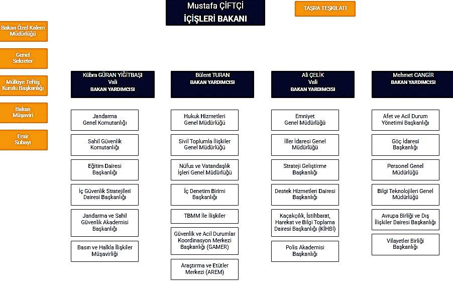 İçişleri Bakanlığı’nda beklenen görev dağılımı resmen açıklandı. Bakan Mustafa Çiftçi’nin imzasıyla yayımlanan yeni karara göre, Bakan Yardımcısı Ali Çelik’e Emniyet Genel Müdürlüğü ile Polis Akademisi Başkanlığı'nın yanısıra üç başkanlık bağlandı.Bakanlık makamının imzasıyla yayımlanan düzenleme kapsamında merkez ve bağlı birimlerin hangi bakan yardımcısına bağlı olarak çalışacağı ayrıntılı şekilde açıklandı.
