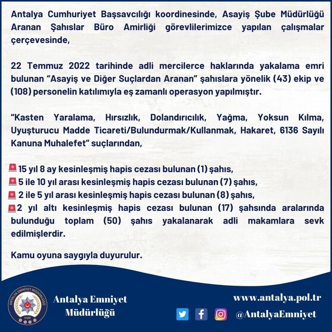 Antalya İl Emniyet Müdürlüğü, basın açıklaması ile Asayiş Şube Aranan Şahıslar Büro Amirliği görevlilerince yapılan operasyonlarla çeşitli suçlardan aranan 50 şahısın yakalanarak adli makamlara sevk edildiğini duyurdu.