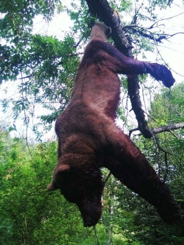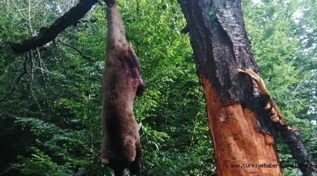 Bartın'ın Hasankadı beldesinde, ormana mantar toplamaya giden vatandaşlar, kapana yakalanarak ağaca asılı halde ölmüş bir boz ayı buldu.