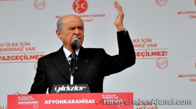 MHP Genel Başkanı Devlet Bahçeli, 16 Nisan referandumu çalışmaları kapsamında Afyonkarahisar’da miting düzenledi. Anıtpark Meydanı’nda yaklaşık 4 bin kişinin katıldığı miting alanına Bahçeli makam aracıyla gelirken, ellerinde Türk bayrakları bulunan atlı bir grup ve partililerce çiçeklerle karşılandı. Türk bayrakları, Atatürk, Alparslan Türkeş ve Bahçeli’nin dev posterlerinin bulunduğu mitingde ‘Türk milletinin bekası için ülkücüler evet diyor’, ‘Anayasanın ilk 4 maddesi değişmeyecek’, ‘Cumhuriyetin kazanıldığı topraklara hoşgeldiniz’ pankartları asıldı. Bahçeli, 16 Nisan referandumu, Kerkük’e Kürdistan bayrağı asılması, Suriye’de Esad yönetiminin kimyasal silahlı saldırısı ve ABD’nin karşılık vermesi ile CHP aleyhine açıklamalarda bulundu.KERKÜK TEPKİSİAy yıldızlı al bayrağın Türkiye, Türk milleti olduğunu belirten Devlet Bahçeli, “Peki, Kerkük’te zorla, baskıyla, tehditle, cebirle asılan kirli bez parçası neyin nesidir? Barzani ve Talabani unsurları Kerkük’te ne haltlar karıştırmaktadır? Kerkük’ün sinir uçlarıyla oynanıyor, görüyoruz. Türkmenlerin hak ve tarihsel miraslarına kast ediliyor, sıkılı yumruklarımızla izliyoruz. Önce Kerkük’teki kamu binalarına sözde Kürdistan bayrağı asmak için karar aldılar. Ardından Irak Meclisi 1 Nisan’da, Kerkük’te tek bayrak asılmasına onay vererek, bölgesel yönetimin hesaplarını tümden boşa çıkardı. Ne var ki mütecaviz komplo durmadı, duraklamadı. Kerkük Vilayet Meclisi 4 Nisan günü, Türkmen ve Arap üyelerin boykot ettiği oturumda, Kerkük’ün Barzani yönetimine ilhakı maksadıyla referanduma gidilmesi kararı aldı. Küresel güçlerin taşeronu olan Barzani ve Talabani çetesi, sözde Kürdistan bayrağının indirilmeyeceğini alçakça söylüyor ve de açıkça kaosa davetiye çıkarıyor” dedi.CUMHURBAŞKANI VE BAŞBAKANA TEŞEKKÜRCumhurbaşkanı Erdoğan’ın da, Kerkük’te milli bayrağın dışında ikinci bir bayrağın asılmasına kesin dille karşı çıktığını, bunun bölücülük olduğunu haykırdığını belirten Bahçeli, “Sayın Erdoğan’ın bu açıklaması milli yüreklere su serpmiş, Türkiye’nin ortak iradesini seslendirmiştir. Kendisine buradan teşekkür ediyorum. Sayın Başbakan’ın ‘Kerkük Türkmen şehridir’ demesi de oldukça anlamlı ve değerlidir. Elbette Kerkük Türktür, Türkmendir, Afyonkarahisar neyse Kerkük odur. Bunu yok sayan kirli ve karanlık mihraklar yine kaybedecek, yine püskürtülecektir. Barzani dikkat etsin, aklını başına alsın, gayrimeşru dayatmalarından vazgeçsin. Şayet Türk milletinin ayranı kabarırsa, milli ruhta mahfuz halde duran taarruz ruhu açığa çıkarsa hayat ona zindan olacaktır” diye konuştu.FIRAT KALKANI HAREKATININ İLK ETABITürk askerinin 216 günlük kahramanca mücadelesinden sonra Fırat Kalkanı Harekatı’nın ilk etabının tamamlandığını dile getiren Devlet Bahçeli, “Türkiye doğru politika, isabetli strateji, yerinde harekâtla önemli bir eşiği aşmıştır. Kim ne söylerse söylesin, Fırat Kalkanı Harekatı başarılı olmuştur. Cerablus’tan El Bab’a kadar Türkiye bölgeye mühür vurmuştur. Türk Silahlı Kuvvetleri’ni kutluyorum, Mehmetçiği alnından öpüyorum. Verdiğimiz 71 şehit Türk milletinin şeref ve varlık haklarını müdafaa etmiştir. PKK-YPG’nin Suriye’de 100 bin kişilik ordu kurmak için mücadele verdiği dillerde, medyanın manşetlerindedir. Menbiç aklımızda, Rakka stratejik hedef kümesindedir ve böyle olmalıdır” dedi.‘ESAD SURİYE’NİN GELECEĞİNDEN SÖKÜP ATILMALIDIR’Suriye lideri Esad’a ait savaş uçaklarının sınırlarımıza 65 km uzaklıkta bulunan İdlib’in Han Şeyhun ilçesinde kimyasal silahlı saldırısını hatırlatan Devlet Bahçeli, şöyle dedi:“Bu insanlık dışı cinayeti lanetliyorum. Peki mazlumlar kimyasal bombalarla öldürülürken insanlık ne yapmaktadır? Birleşmiş Milletler neyle oyalanmaktadır? 16 Nisan’da yapacağımız referandumu bulandırmaya, baltalamaya, tercihleri etkilemeye, algıları yönetmeye kalkışan Avrupa ülkeleri neyle meşguldür? Hani nerede insan hakları? Hani nerede uluslararası hukukun ilke ve kuralları? Esad katil ve insanlık düşmanıdır. Bebeklere kıyan diktatördür, adi bir suçludur. Cani Esad’ın meşruiyet ve ahlaki inandırıcılığı kalmamıştır. Çünkü Esad kana bulanmış, acımasız ve vahşi suçluya dönmüştür. Bu sabaha karşı Doğu Akdeniz’den atılan 59 füzeyle Suriye’nin Şayrat Hava Üssü vurulmuştur. Masumlara alçakça saldıran, bebeklere zehirli gaz fırlatan Esad yönetimi layığını bulmuş, cevabını almıştır. Esad’ın insanlık dışı saldırı ve katliamlarına verilen füzeli karşılık olumlu ve yerindedir. Ve de Esad Suriye’nin geleceğinden sökülüp atılmalıdır.”Suriye konusunda Türkiye’nin adaletin yanında yer alması gerektiğini de belirten Bahçeli, Türkiye’nin sivil ve masum canlara kast eden katillerin tam karşı cephesinde durması gerektiğini söyledi.HAYIR DİYEN KARDEŞLERİMİZ DE DEĞERLİDİRReferandum konusuna da değinen Devlet Bahçeli, “Evet dedik diyeli hainler korkuyor, siniyor, mum gibi eriyor. Evet dedik diyeli millet düşmanları telaşla sağa sola kaçışıyor. Ama nafile, kaçamayacaklar, kurtulamayacaklar, mutlaka tuzakları yıkılacak, oyunları bozulacak. Bizim için evet diyen kardeşlerim kadar, hayır diyen kardeşlerimiz de değerlidir. İnancım odur ki, hayır diyenler, kararsızlık geçirenler evete dönecek, Türkiye lehine tavır alacaklardır. Kaldı ki beklentimiz de budur” dedi.CHP’YE AĞIR ELEŞTİRİLERCHP’yi de hedef alan ve sert eleştirilerde bulunan Bahçeli, şöyle konuştu;“Terör örgütlerinin kuyruğuna takılan, Türkiye muhaliflerinin dizlerine kapanan CHP, şimdi k