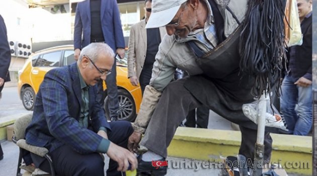 Kalkınma Bakanı Lütfi Elvan, esnaf gezisi sırasında boya sandığının başına geçtiği Salim Tokat'ın ayakkabılarını fırçalayarak cila sürdü.