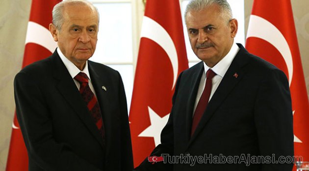 Başbakan Binali Yıldırım, MHP Genel Başkanı Devlet Bahçeli ile görüştü. Çankaya Köşkü'nde basına kapalı gerçekleşen görüşme yaklaşık 40 dakika sürdü. Görüşme sonrası iki lider, ortak açıklama yapmak üzere kameraların karşısına geçti ve önemli açıklamalarda bulundu. Başbakan Binali Yıldırım, "Diğer siyasi partilerimiz de parti rozetlerini, düşüncelerini bir kenara bırakarak topyekün olarak terör odaklarına karşı darbe girişimlerine karşı tek yürek olmuş, bu bela defedilmiştir" dedi.Yıldırım, yaptığı konuşmada 15 Temmuz gecesinin, Türkiye'nin geleceğine, demokrasisine, milli iradesine yönelik darbe kalkışmasının milletin kararlılığıyla etkisiz hale getirildiğini belirterek, "Darbe ile ilgili süreç, milletimiz adına başarıyla tamamlanmıştır. Ancak, işimiz bitmemiştir. Bundan sonra, MHP Genel Başkanı Devlet Bahçeli'nin de ifade ettiği gibi yapacak çok işimiz var. İstiyoruz ki bu ve buna benzer acıları milletimiz tekrar yaşamasın, gençlerimizin geleceği karartılmasın. Bu girişimin ilk anından itibaren Sayın Genel Başkan telefonla arayarak bu konuda her türlü desteğe hazır olduğunu ifade etmiştir. Sadece destek değil, meydanlarda biz de olacağız demiştir, partililerimizle, taraftarlarımızla. Yine, diğer siyasi partilerimiz de parti rozetlerini, düşüncelerini bir kenara bırakarak topyekün olarak terör odaklarına karşı darbe girişimlerine karşı tek yürek olmuş, bu bela defedilmiştir. Bundan sonra yapacak işimiz var, onu da inşallah önümüzdeki günlerde yapacağız. Türkiye'de artık bölücü terör, darbe girişimleri halkın gündemini işgal etmekten çıkarılacak" ifadelerini kullandı. "Ülkemizde tabii ki farklılıklarımız var, hepimiz aynı ten rengine sahip değiliz gözlerimizin renkleri farklı ama farklı olmayan birşey var, hepimizin gözlerinden akan yaşların rengi aynı" diyen Yıldırım, "Bu tabloyu muhafaza etmek de biz sorumlu konumdaki kişilerin en büyük görevi olmalıdır. MHP, baştan beri bu hassasiyeti hep göstermiştir. Mesele Türkiye olunca, memleket olunca gerisi teferruattır anlayışının bugün de sürdüğünü görmekten memnuniyet duydum. Bir kez daha bize verdiği katkıdan dolayı şükranlarımı sunuyorum" şeklinde konuştu.BAHÇELİ: TÜRKİYE BU BELADIN KURTULMUŞTURürkiye'nin bir beladan kurtulduğunu dile getiren Bahçeli ise, "Bugün saat 13.00'da bir araya gelerek son günlerde yaşanmış olan sıcak gelişmeler üzerinde bizleri çok yönlü bilgilendirme fırsatını kullanarak önümüzdeki değerlendirmelerde ışık tutabilecek yaklaşımlar ortaya koymuştur. 15 Temmuz günü gece başlayan ve Türkiye'yi bir felakete götürecek olan bir darbe teşebbüsü mevcut siyasi iktidarın kararlı ve dik duruşu sayesinde çok kısa süre içinde engellenmiştir. Bu, siyasi kurumlar arasında dayanışma ruhunu geliştirmiştir. Demokrasi tercihinde ortak bir akıl hakim olmuştur ve çok kısa süre içerisinde darbenin henüz daha sonuçları net görülmemekle beraber önemli ölçüde tehlike boyutundan uzaklaştığı hissedilmektedir. Toplumumuzda rahatlama olmuştur, normal hayat devam etmektedir. Bu konuyla ilgili siyasi iktidarın alabileceği, tekrar darbenin bütün unsurlarını kaldırabilecek, gelecekte böyle bir teşebbüse bir daha imkan tanımayacak değerlendirmelerinde MHP olarak Meclis'te temsil edilen 40 milletvekilimizle ve halktan aldığımız destekle, iktidarın bu gayretlerinin yanında olacağımızı Sayın Başbakanımıza bir kez ifade ettik. Türkiye, bir beladan kurtulmuştur. Başbakana teşekkür ediyorum, milletimize geçmiş olsun diyorum" diye konuştu.