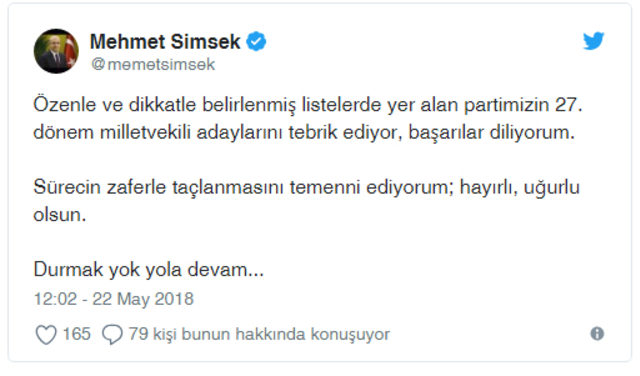 24 Haziran'da yapılacak Cumhurbaşkanı ve 27. Dönem Milletvekili Genel Seçimi için milletvekili aday listesinde yer almayan Başbakan Yardımcısı Mehmet Şimşek, Twitter hesabından yaptığı açıklamada,"Özenle ve dikkatle belirlenmiş listelerde yer alan partimizin 27. dönem milletvekili adaylarını tebrik ediyor, başarılar diliyorum.Sürecin zaferle taçlanmasını temenni ediyorum; hayırlı, uğurlu olsun.Durmak yok yola devam..." ifadelerini kullandı.