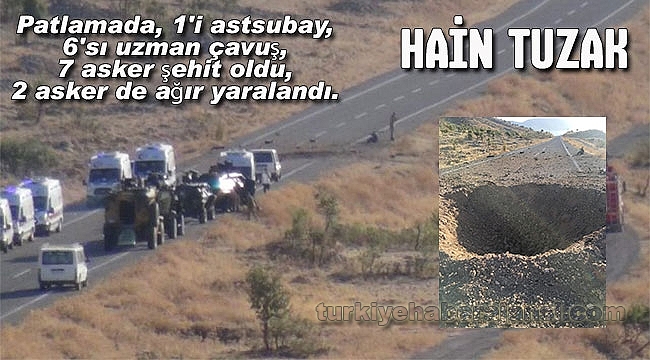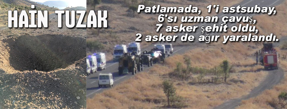 ŞEHİT SAYISI 7'YE YÜKSELDİHastanede tedavi altına alınan 5 yaralı askerden 3'ü tüm müdahalelere rağmen kurtarılamayarak şehit oldu ve hain saldırıda şehit sayısı 7'ye yükseldi.Saldırının ardından kaçan teröristlerin etkisiz hale getirilmesi amacıyla, bölgede hava destekli geniş çaplı operasyonların sürdüğü bildirildi.Öte yandan saldırıda kullanılan el yapımı patlayıcının yola uzun süre önce tuzaklandığı, yolda asfaltlama yapıldığından arama faaliyeti yürütüldüğü sırada patlayıcının dedektör cihaz tarafından algılanmadığı öğrenildi.