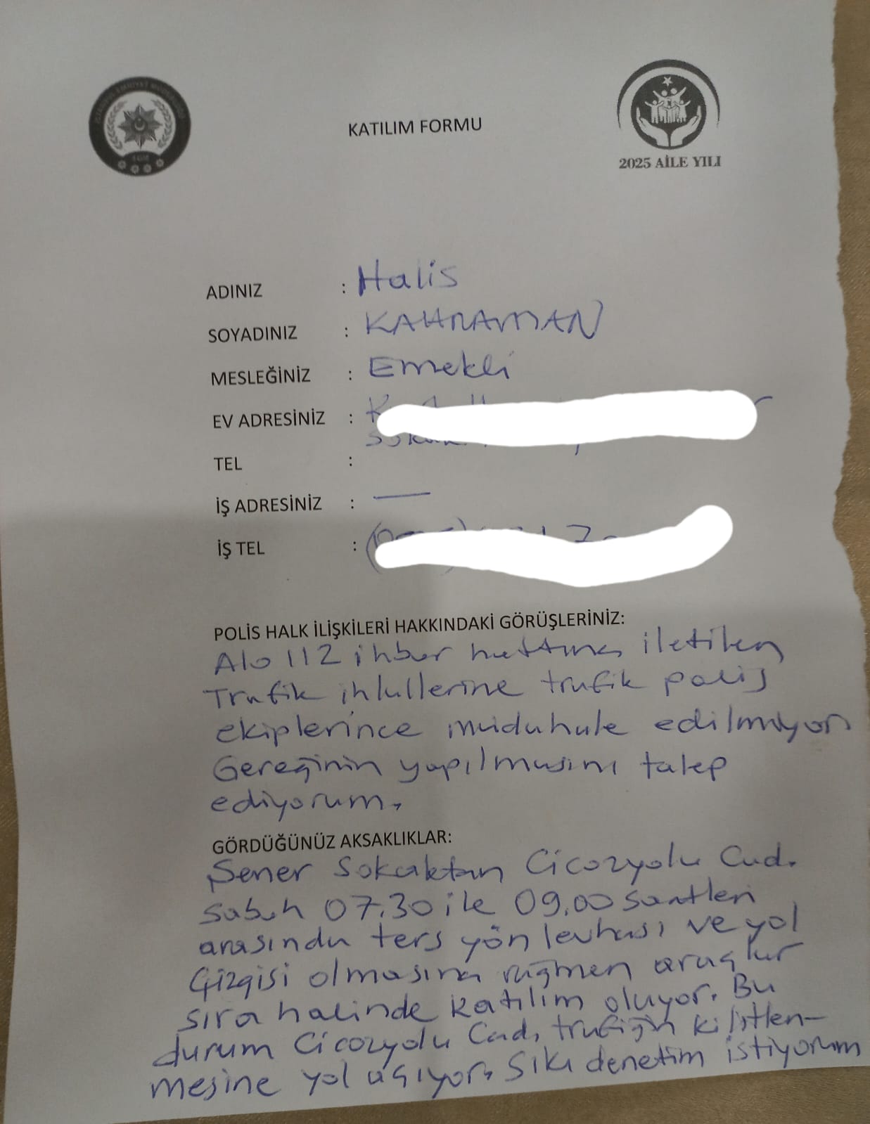 KATILIM FORMUNA TRAFİK ŞİKAYETİ YAZDI Halis Kahraman, ayıca görevli polisler tarafından toplantıya katılanlara dağıtılan istek ve şikayetlerin yazılmasının istendiği katılım formuna da bir başka talebini de yazdı.