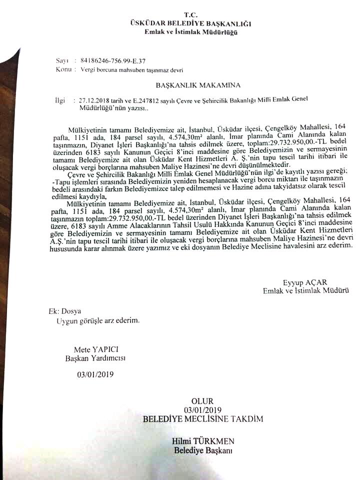 Ve Üsküdar Belediyesi Meclisi Ocak ayı oturumlarında skandal niteliğinde bir karara imza atarak cami satışına karar vermiş oldu.EMLAK MÜDÜRÜ TEKLİF ETTİEmlak ve İstimlak Müdürü Eyyüp Acar’ın talebi üzerine Meclis gündemine gelen teklifte Üsküdar Çengelköy’deki 4 bin 574.30 metrekare alanlı Güzeltepe Birlik Camii’nin ilçe belediyesinin ve sermayesi belediyeye ait Üsküdar Kent Hizmetleri A.Ş’nin vergi borçlarına mahsuben Maliye Hazinesi’ne devrinin düşünüldüğü belirtildi.Teklifte, caminin Diyanet İşleri Başkanlığı’na tahsis edileceği, değerinin de toplam 29 milyon 732 bin 950 lira olduğu ifade edildi.