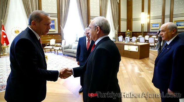 Cumhurbaşkanı Recep Tayyip Erdoğan'ın, AK Parti Genel Başkanı ve Başbakan Binali Yıldırım, CHP Genel Başkanı Kemal Kılıçdaroğlu ve MHP Genel Başkanı Devlet Bahçeli'yi kabulü başladı.Erdoğan'ın, Cumhurbaşkanlığı Külliyesi'nde basına kapalı gerçekleşen kabulü, saat 14.06'da başladı.AK Parti, CHP ve MHP'ye MektupDün, Cumhurbaşkanlığı Genel Sekreteri Fahri Kasırga tarafından CHP, MHP ve AK Parti Genel Sekreterlerine gönderilen mektupta, "FETÖ mensubu teröristler, Türkiye Cumhuriyeti Hükümeti'ni ortadan kaldırmak amacıyla gerçekleştirilen silahlı darbe teşebbüsü, milletimizin ortaya koyduğu kahramanca direniş sayesinde engellenmiştir" ifadelerine yer verildi.Teşekkür Edip Önerilerini AlacakBirlik ve beraberliğin en üst düzeyde olması gerektiği belirtilen mektupta, "Milletimiz siyasi partilerimizden de bunun gereğini yerine getirmesini beklemektedir" denildi.Mektubun son kısmında şu ifadelere yer verildi:"Sayın Cumhurbaşkanımız 25 Temmuz Pazartesi günü saat 14.00'te CHP Genel Başkanı Sayın Kemal Kılıçdaroğlu ve MHP Genel Başkanı Sayın Devlet Bahçeli ile AK Parti Genel Başkanı Sayın Binali Yıldırım'ı, hem darbe girişimi karşısındaki kararlı tutumu sebebiyle kendilerine teşekkür etmek, hem de son gelişmeleri değerlendirip, önerilerini almak üzere, Beştepe Cumhurbaşkanlığı Külliyesi'ne davet etmektedir."