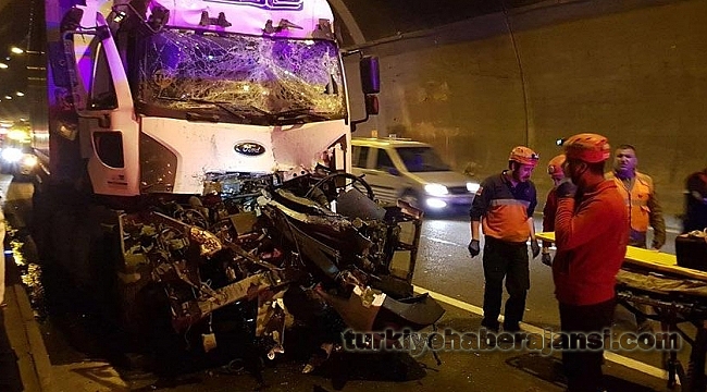 Kaza, saat 19.30 sıralarında tem otoyolu Bolu Dağı Tüneli içi Ankara istikametinde meydana geldi.Edinilen bilgiye göre, Ankara istikametine seyir halinde olan Zeki Salih (64) idaresindeki 01 DJK 75 plakalı tır, aynı istikamette ilerleyen Barış Sekmen yönetimindeki 44 HE 733 plakalı tıra tünel içerisinde hızla arkadan çarptı.ARAÇTA SIKIŞAN SÜRÜCÜ HAYATINI KAYBETTİKazayı gören diğer sürücülerin ihbarı üzerine olay yerine 112 Sağlık, UMKE ve itfaiye ekipleri sevk edildi. Hurdaya dönen tırın çekici kısmında sıkışan sürücü Zeki Salih'in olay yerinde yaşamını kaybettiği tespit edildi. İtfaiye ekipleri tarafından sıkıştığı yerden çıkarılan Zeki'nin cesedi, Cumhuriyet Savcısı'nın incelemesinin ardından İzzet baysal devlet hastanesi köroğlu Ünitesi morguna kaldırıldı. Kazayla ilgili soruşturma başlatıldı.