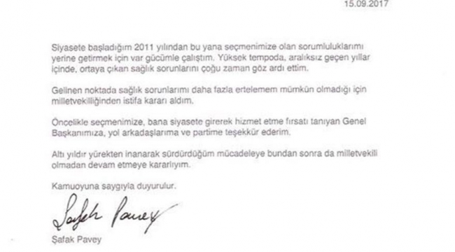 Sol kolu ve sol bacağı protez olan CHP Milletvekili Şafak Pavey, sağllık sorunlarını gerekçe göstererek milletvekililğinden istifa etti.Açıklamasında seçmenlere ve CHP Genel Başkanı Kemal Kılıçdaroğlu’na teşekkür eden Şafak Pavey, “Altı yıldır yürekten inanarak sürdürdüğüm mücadeleye bundan sonra da milletvekili olmadan devam etmeye kararlıyım” ifadelerini kullandıŞafak Pavey yaptığı basın açıklamasında şu ifadelere yer verdi;“Siyasete başladığım 2011 yılından bu yanba seçmenimize olan sorumluluklarımı yreine getirmek için var gücümle çalıştım. Yüksek tempoda, aralıksız geçen yıllar içinde, ortaya çıkan sağlık sorunlarını çoğu zaman göz ardı ettim.Gelinen noktada sağlık sorunlarımı daha fazla ertelemem mümkün olmadığı için milletvekilliğinden istifa kararı aldım.Öncelikle seçmenimize, bana siyasete girerek hizmet etme fırsatı tanıyan Genel Başkanımıza, yol arkadaşlarıma ve partime teşekkür ederim.Altı yıldır yürekten inanarak sürdürdüğüm mücadeleye bundan sonra da milletvekili olmadan devam etmeye kararlıyım.Kamuoyuna saygıyla duyurulur.