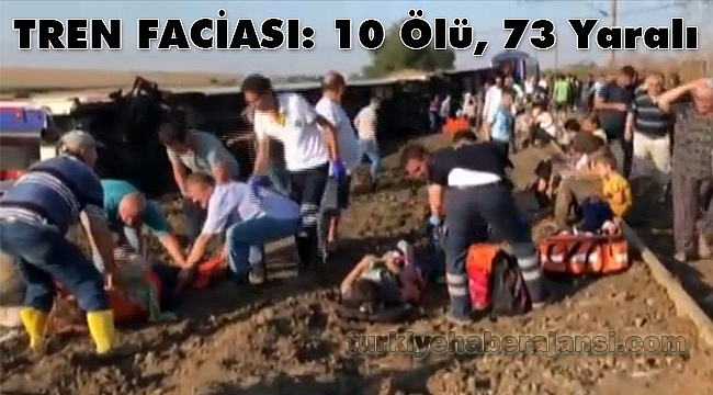 Sağlık Bakanlığı, aşırı yağışlar nedeniyle gerçekleştiği ileri sürülen tren kazasında 10 kişinin öldüğünü, 73 kişinin de yaralandığını açıkladı. Yolculuk sırasında trende 362 yolcu ve 6 personel bulunuyordu. “10 ÖLÜ, 73 YARALI”Edirne Uzunköprü’den 362 yolcu ve 6 personel ile Halkalı’ya gitmek üzere 15.40’ta hareket eden yolcu treni (08.07.2018) dün saat 17.00 sıralarında Tekirdağ'ın Muratlı ile Çorlu ilçeleri arasındaki Sarılar Mahallesi'nde raydan çıkarak devrildi. Metrelerce sürüklenen trende bulunan yolcular büyük korku ve dehşet yaşadı.