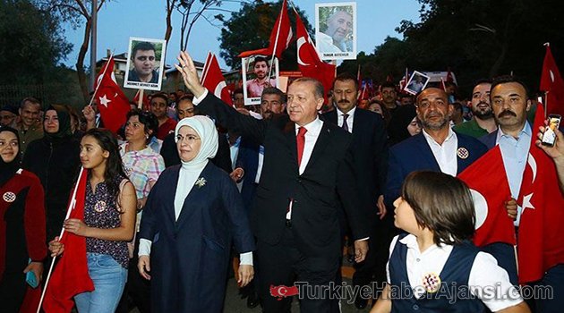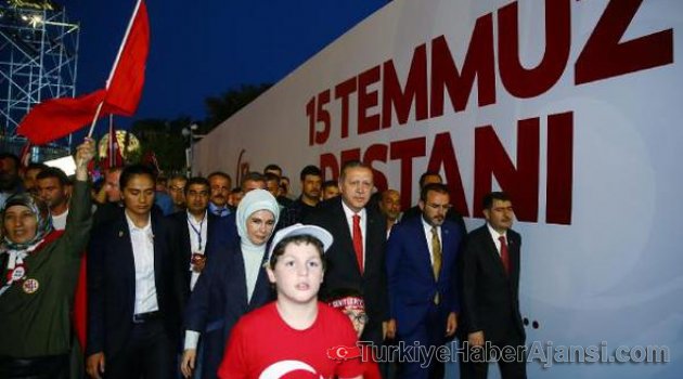 Cumhurbaşkanı Recep Tayyip Erdoğan, 15 Temmuz Şehitler köprüsündeki tören alanına yürüyerek geldi.Helikopter ile Nakkaştepe'ye inen Erdoğan, beraberindekilerle buradan tören alanına yürüdü.Köprüdeki ve köprüye giden yoldaki kalabalık, havanın da kararmasıyla muhteşem görüntüler ortaya çıkardı.