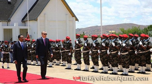 Cumhurbaşkanı Recep Tayyip Erdoğan, resmi ziyaret için geldiği Madagaskar'da Cumhurbaşkanı Hery Rajaonarimampianina tarafından törenle karşılandı.Cumhurbaşkanı Erdoğan, Tanzanya ve Mozambik temaslarının ardından Doğu Afrika turunun son durağı olan Madagaskar programına başladı.Madagaskar'da Cumhurbaşkanı Rajaonarimampianina, Erdoğan'ı Cumhurbaşkanlığı Sarayı'nda resmi törenle karşıladı.İki Ülkenin Milli Marşları ÇalındıCumhurbaşkanı Erdoğan ve Rajaonarimampianina'nın tören alanındaki yerlerini almasının ardından iki ülkenin milli marşları çalındı. Erdoğan, Muhafız Alayı Tören Kıtası'nı selamladı.İki ülke heyetlerinin takdimi sonrasında Erdoğan ve Rajaonarimampianina, Cumhurbaşkanlığı Sarayı'na geçti.Burada Madagaskar haritasını inceleyen Erdoğan ve Rajaonarimampianina, karşılamanın ardından baş başa ve heyetler arası görüşmelere başladı.Törende, Cumhurbaşkanı Erdoğan'ın eşi Emine Erdoğan, Dışişleri Bakanı Mevlüt Çavuşoğlu, Ekonomi Bakanı Nihat Zeybekci, Enerji ve Tabii Kaynaklar Bakanı Berat Albayrak ile Cumhurbaşkanlığı Genel Sekreter Yardımcısı ve Sözcüsü İbrahim Kalın da hazır bulundu.