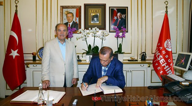 Cumhurbaşkanı Recep Tayyip Erdoğan, Şehzade Cami’nde öğle namazına müteakip Prof. Dr. İlhan Varank ve şehitler için düzenlenen mevlit programına katıldı. Cumhurbaşkanı Erdoğan’a TBMM Başkanı İsmail Kahraman, İstanbul Büyükşehir Belediye Başkanı Kadir Topbaş ve İstanbul Valisi Vasip Şahin eşlik etti.TOPBAŞ'TAN BİLGİ ALDIDaha sonra Başkan Kadir Topbaş ile İstanbul Büyükşehir Belediyesi’nin Saraçhane’deki merkez binasına geçen Cumhurbaşkanı Recep Tayyip Erdoğan, 15 Temmuz’daki hain darbe girişiminde İstanbul Büyükşehir Belediyesi önünde yaşanan görüntüleri izledi ve Kadir Topbaş’tan çalışmalar hakkında bilgi aldı.TÜM GÜCÜMÜZLE ÜSTÜNE GİDECEĞİZZiyaretin ardından İBB’nin önünde basın mensuplarına açıklama yapan Cumhurbaşkanı Erdoğan, Gaziantep’te yaşanan canlı bomba olayında 51 vatandaşın hayatını kaybettiğini, hastanelerde 17’si ağır 69 yaralının olduğunu belirterek, “Ölenlerin ailelerine şahsım ve milletim adına başsağlığı diliyorum. Birliğimizi ve beraberliğimizi daim kılmak suretiyle tüm terör belasının üstüne birlikte gitmemiz gerekiyor. Terör nerden gelirse gelsin hepsi bizim için terördür. Bunların dini, milleti, vatanı söz konusu değildir. Türkiye olarak 15 Temmuz’da olduğu gibi tüm gücümüzle bunların üzerine gideceğiz” diye konuştu.ŞOK OLMAMAK MÜMKÜN DEĞİL“Önünde bulunduğumuz İstanbul Büyükşehir Belediyesi 15 Temmuz’da gazi bir belediye olmuştur. Burada ne yazık ki 17 şehidimiz oldu” ifadesini kullanan Cumhurbaşkanı Erdoğan, “Az önce görüntülerini izledim, şok olmamak mümkün değil. Silahlı kuvvetlerimizin içine sızmış asker giysisi içerisindeki bu teröristlerin şu arkamızdaki sütunların arkasına sığınarak buradan vatandaşlara nasıl nokta atışı yaptıklarının o görüntülerini izledim. Temenni ediyorum ki bundan sonra bu tür şeylere rastlamayız. Yine temenni ederim ki bu gafiller böyle bir yanlışı bundan sonraki süreçte yapmazlar” şeklinde konuştu.Burada şeref defterini imzalayan Cumhurbaşkanı Erdoğan şunları yazdı..."15 Temmuz 2016 darbe girişiminden sonra "Gazi İstanbul Belediye Başkanlığı'nı ziyaret ediyorum. Püskürtülen bu darbe girişiminde 240 şehidimiz var. 2190 yaralımız var. Şehitlerimize Allah'tan rahmet diliyorum. Gazilerimize şifalar diliyorum. Milletimizin başı sağ olsun"