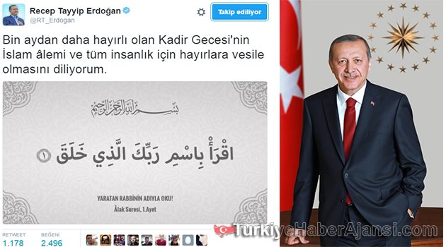 Cumhurbaşkanı Recep Tayyip Erdoğan, sosyal paylaşım sitesi Twitter'daki resmi hesabında Kadir Gecesi mesajı yayınladı.Cumhurbaşkanı Erdoğan, "Bin aydan daha hayırlı olan Kadir Gecesi'nin İslam âlemi ve tüm insanlık için hayırlara vesile olmasını diliyorum" ifadelerini kullandı. Erdoğan, mesajının yanında Alak suresinin 1. ayetini de paylaştı.