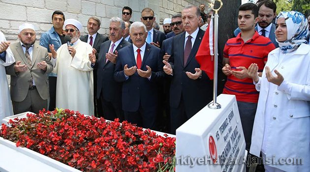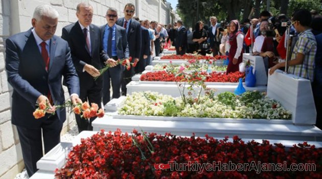 Cumhurbaşkanı Erdoğan 15 Temmuz Şehitlerini anmak üzere Edirnekapı’daki 15 Temmuz Şehitliği’ne geldi. Erdoğan’ı şehitlik girişinde Başbakan Binali Yıldırım, Aile ve Sosyal Politikalar Bakanı Fatma Betül Sayan Kaya, Vali Vasip Şahin, İstanbul Büyükşehir Belediye Başkanı Kadir Topbaş, AKP İstanbul İl Başkanı Selim Temurci karşıladı.KURANI-I KERİM OKUDUCumhurbaşkanı Erdoğan ve beraberindekiler 15 Temmuz Şehitliği’nde kabirleri ziyaret etti. Erdoğan 15 sivil şehidin bulunduğu şehitlikte Kuran-ı Kerim okudu, dua etti. Cumhurbaşkanı Erdoğan ile Başbakan Yıldırım buradan yürüyerek Edirnekapı Polis Şehitliği’ne geçti. Yaklaşık 2 saat süren anma ve kabir ziyaretlerinin ardından Cumhurbaşkanı Erdoğan ile beraberindekiler Prof. Dr. İlhan Varank’ın kabrinin bulunduğu Şehzadebaşı Camii’ne geçti. Erdoğan şehitlik çıkışında, kendisini görmek için bekleyen vatandaşları aracının camını açıp selamladı.GENİŞ GÜVENLİK ÖNLEMİÖte yandan Erdoğan’ın şehitlikte olduğu sırada polis de üst düzey güvenlik önlemi aldı. Edirnekapı Kavşağı araç trafiğine kapatıldı. Tarihi surlara ve çevredeki cami minarelerine keskin nişancılar yerleştirildi.BURSA’DA ŞEHİTLİK ZİYARETİBursa'da ise Ulucamii’ye sabah namazına gelen cemaate sabah namazının ardından cami avlusunda çorba ikram edildi. AKP İl Başkanı Cemaletin Torun, hain FETÖ mensuplarının ülkeyi işgal etmeye çalıştıklarını aktarırken, şunları söyledi:“Türkiye çok önemli bir süreci aziz milletin ferasetli ve dik duruşuyla, canını ortaya koymasıyla atlattı. O günkü olaylarda 250 şehidimiz ve 2 bin 194 gazimiz oldu. Şehitlerimizi rahmet ve minnetle yad ediyorum. Gazilerimizi de hayırlı uzun ömürler diliyorum. Bu olayları unutmamak ve unutturmamak adına bu tür etkinlikleri her yıl düzenleyeceğiz. Etkinlikleri Ulucamii’de kıldığımız sabah namazıyla başlattık. Her gün etkinliklerimiz devam edecek. 15 Temmuz’u 16 Temmuz’a bağlayan gece 15 Temmuz Demokrasi Meydanında sabaha kadar demokrasi nöbeti tutacağız. Orada çok farklı etkinliklerimiz olacak. Bu tür etkinliklerimizi her yıl gerçekleştireceğiz.”Ulucamii'de dağıtılan çorbanın ardından AKP il başkanı Cemaletin Torun, Bursa Büyükşehir Belediyesi Başkanvekili Abdülkadir Karlık, AKP Bursa milletvekilleri Emine Yavuz Gözgeç, Hakan Çavuşoğlu, Osman Mesten ve Muhammet Müfit Aydın, Osmangazi Belediye Başkanı Mustafa Dündar ile kamu kuruluşları ve sivil toplum kuruluşlarının temsilcileri Pınarbaşı Şehitliğine yürüdü. Şehitlikte 15 Temmuz şehitleri için Kuran'ı Kerim okunduktan sonra edilen duaların ardından vatandaşlar dağıldı.