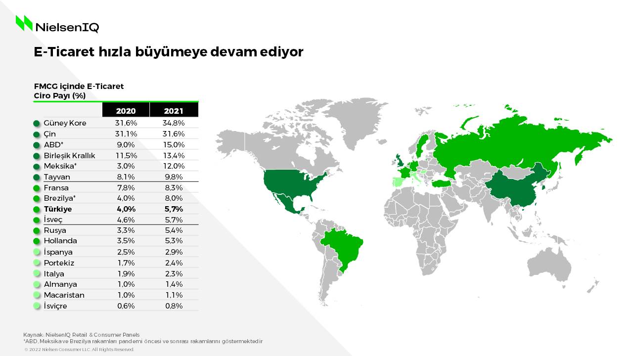 Dünyanın önde gelen pazar araştırma şirketlerinden NielsenIQ’nun araştırmalarına göre; Türkiye'de online harcamalarla birlikte dinamik bir büyüme gösteren hızlı tüketim ürünleri pazarı toplam satışlarının %5,7'sine ulaştı. E-ticaret alanında 2021 yılında, 2020’ye kıyasla %88 büyüme gözlendi.