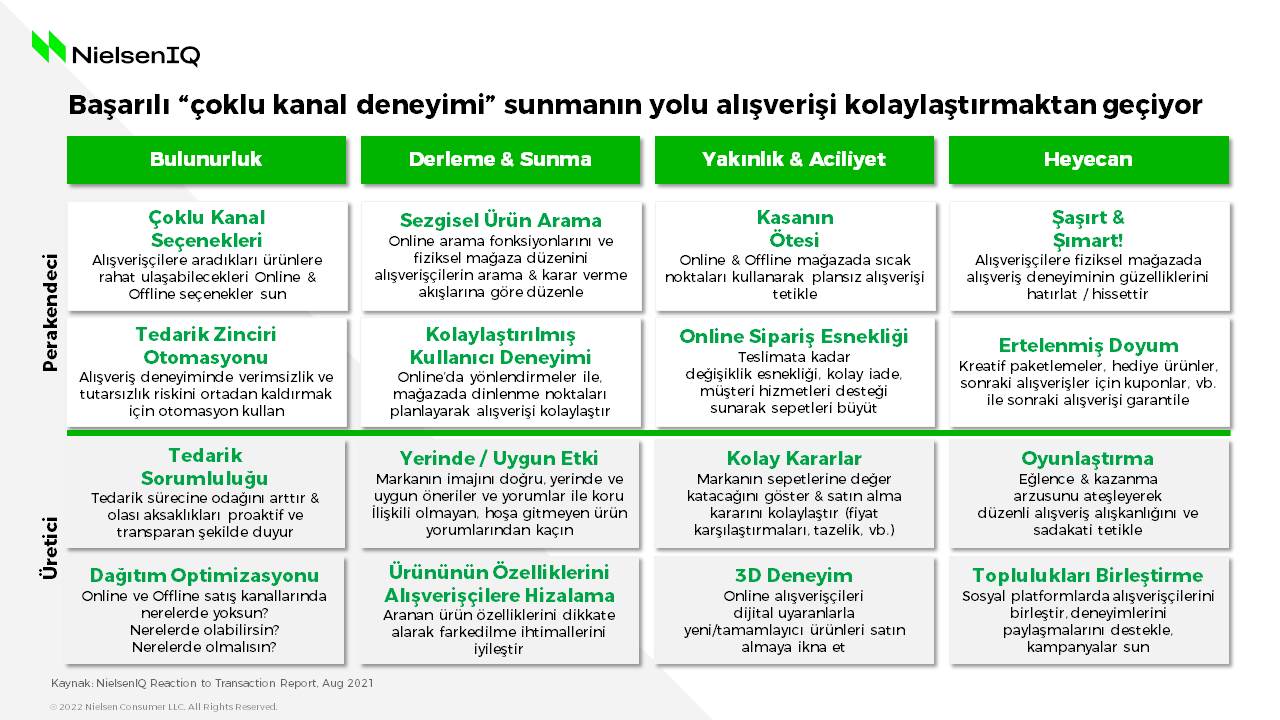 Yakınlık ve Aciliyet başlığında, perakendecilerin ürünlerle alışverişçiler arasında yeni temas noktaları oluşturmaları öne çıkan bir diğer nokta. Ayrıca perakendeciler, teslimata kadar değişiklik esnekliği, kolay iade vb. uygulamalarla da alışveriş sepetlerini büyütebilir. Üreticilerin ise, markalarının sepete katacağı değer önerisini doğru konumlamaları ve dijital uyaranlarla anlık/plansız alışverişleri desteklemeleri atılması gereken adımlar arasında.
