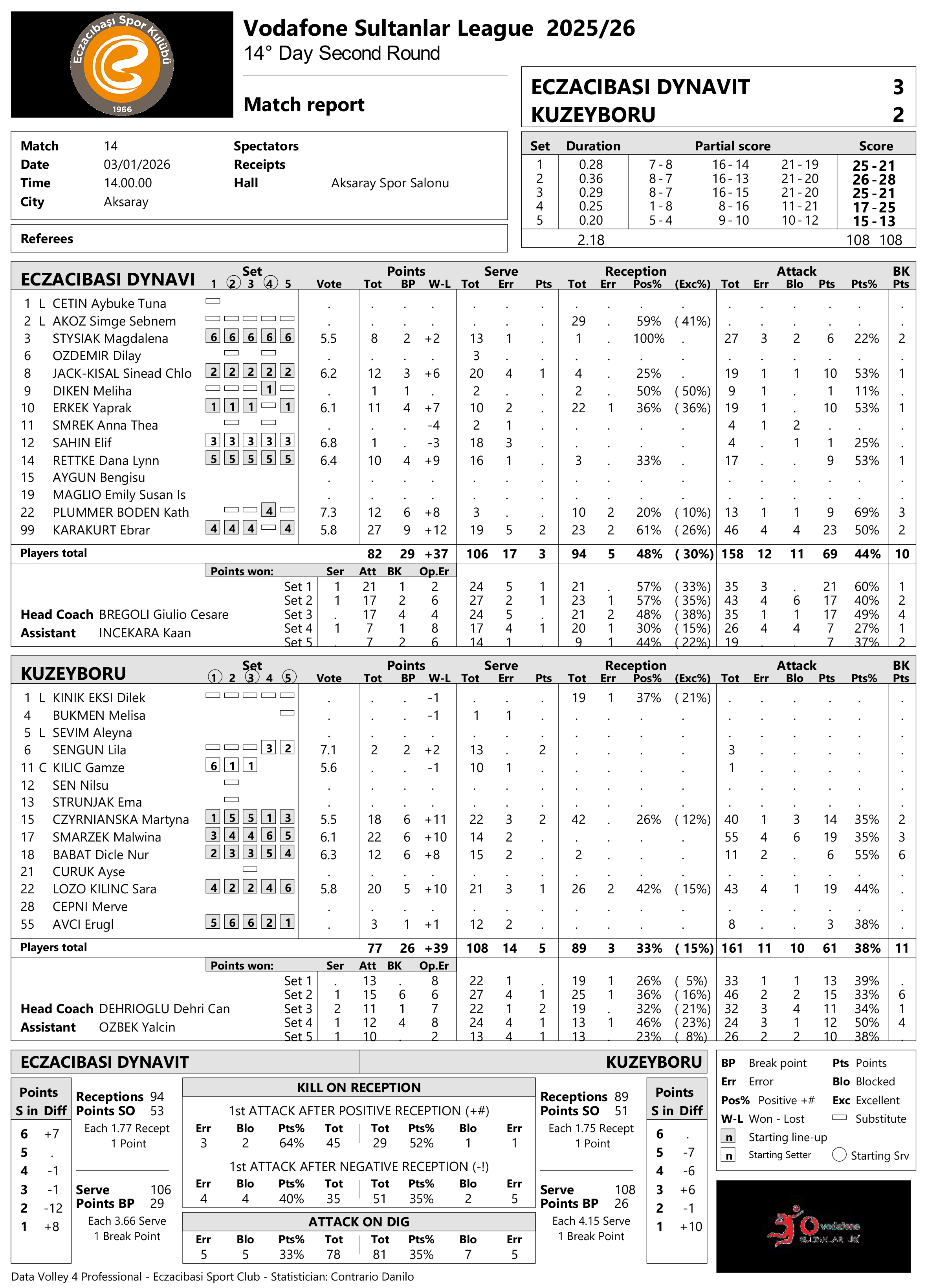 Aldığı 27 sayıyla Ebrar Karakurt karşılaşmanın en skorer ismi oldu. Kaydettikleri 12’er sayıyla Kathryn Boden ve Sinead Jack-Kısal galibiyette önemli rol oynadı. Eczacıbaşı Dynavit’li oyuncular toplamda 10 blok ve 3 servis sayısı elde etti.