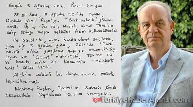 Eski Genelkurmay Başkanı, emekli Orgeneral İlker Başbuğ, kendi el yazısıyla bir mesaj paylaştı. Başbuğ, "Allah'ın adaleti bu dünyada da gerçekleşebiliyormuş. Mahkeme Başkanı, üyeleri ve savcısı şimdi cezaevinde. Yaptıklarının hesabını verecekler" dedi.İlker Başbuğ Twitter hesabından bir mesaj yayınladı. Başbuğ mesajında 5 Ağustos hatırlatması yaparak şunları söyledi:"Bugün 5 Ağustos 2016. Önemli bir gün.95 yıl önce; 5 Ağustos 1921'de TBMM, Mustafa Kemal Paşa'ya "Başkomutanlık" görevini verdi. Üç ay süre ile; Mustafa Kemal TBMM'nin sahip olduğu meşru yetkileri fiilen kullanabilecekti.Ne gariptir ki, veya kasıtlı olarak seçilerek, yine bir 5 Ağustos günü; 2013'te "Türk Milleti" adına yargılama yaptığını utanmadan söyleyen bir "cemaat" mahkemesi, TSK'ya iki yıl komuta eden bir komutana "müebbet hapis" cezası verdi.Allah'ın adaleti bu dünyada da gerçekleşebiliyormuş.Mahkeme Başkanı, üyeleri ve savcısı şimdi cezaevinde. Yaptıklarının hesabını verecekler."