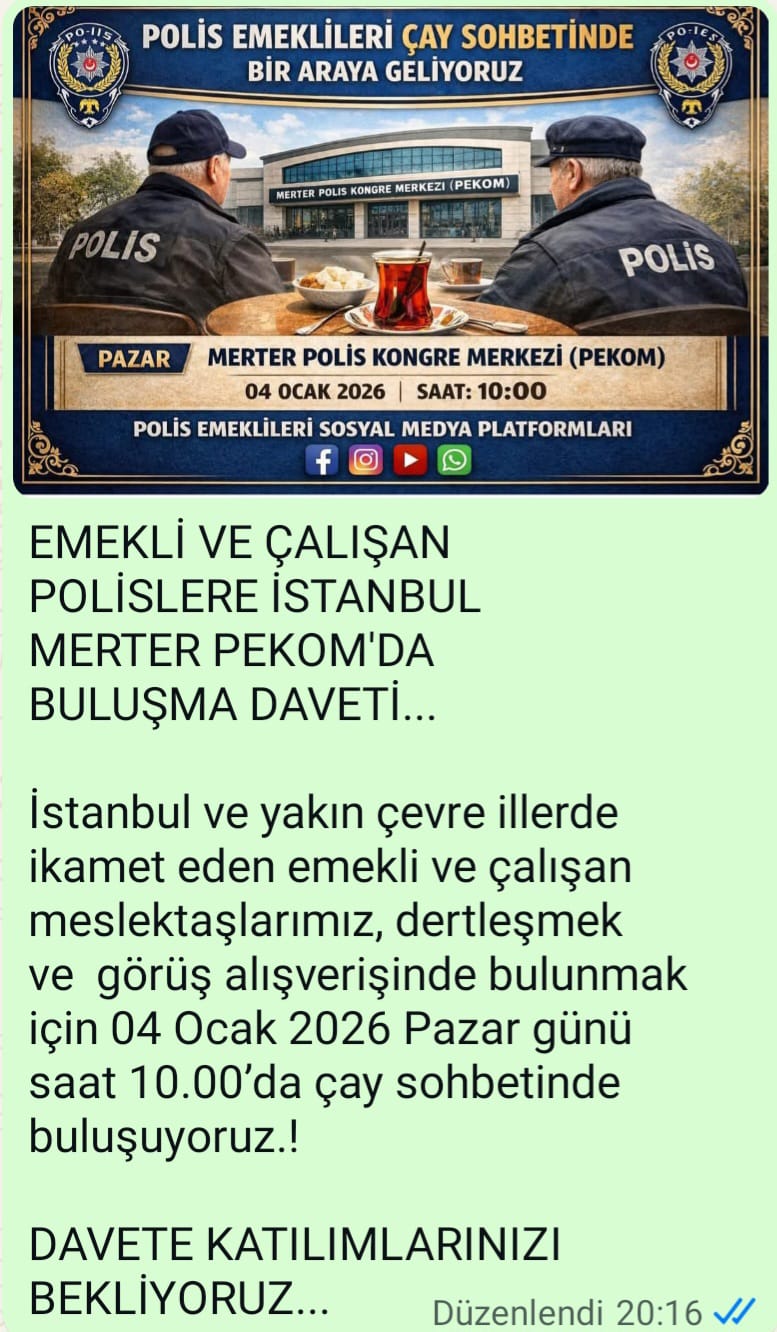 Türkiye Polis Emeklileri Dayanışma Platformu Başkanı Halis Kahraman, çalışan ve emekli polis meslektaşları ile dertleşmek ve görüş alışverişinde bulunmak amacıyla, 4 Ocak pazar günü İstanbul Merter Polisevi'nde (PEKOM) saat 10.00'da çay sohbeti buluşma daveti paylaştı. Başkan Halis Kahraman'ın platformda paylaştığı çay sohbeti buluşma daveti'nde şu ifadeler yer aldı :