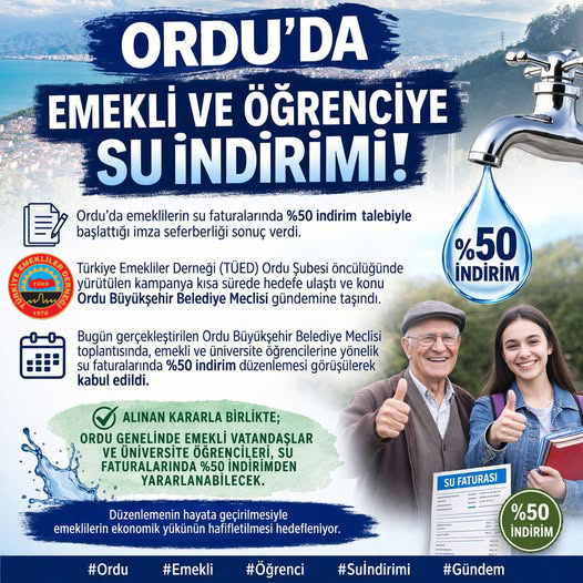 En yüksek fiyatlı suyun Ordu’da tüketildiğine dair iddiaların ardından Ordu Büyükşehir Belediyesi (OBB) Nisan Ayı Meclis Toplantısı’ndan sevindirici karar çıktı .OBB Meclisi il genelinde emekliler ve üniversite öğrencileri için su faturalarında yüzde 50 oranında indirim uygulanması kararı aldı.