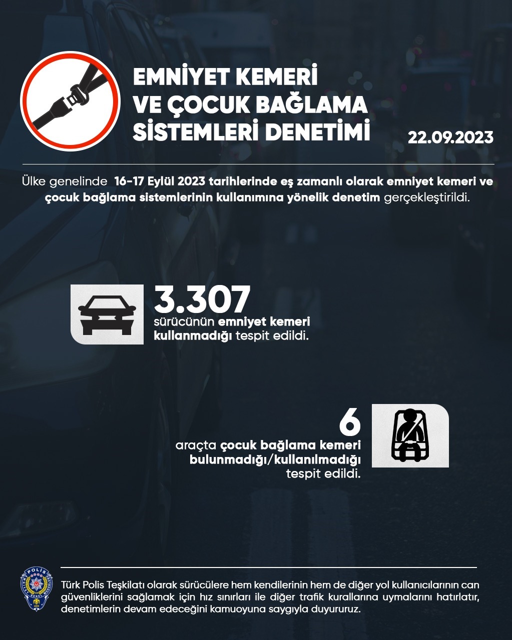 Emniyet Genel Müdürlüğü'nün denetim sonuçlarına ilişkin açıklamasında şu ifadeler yer aldı : "Yapılan denetimlerle trafik kazası sonucu meydana gelen ölüm ve yaralanmaların en aza indirilmesi, sürücülerin ve yolcuların trafik kurallarına uyma düzeylerinin artırılması amacıyla 16-17 Eylül 2023 tarihlerinde emniyet kemeri ve çocuk bağlama sistemlerinin kullanımına yönelik ülke genelinde eş zamanlı denetimler gerçekleştirildi.Denetimlerde ; • 3 bin 307 sürücü/yolcunun emniyet kemeri kullanmadığı,