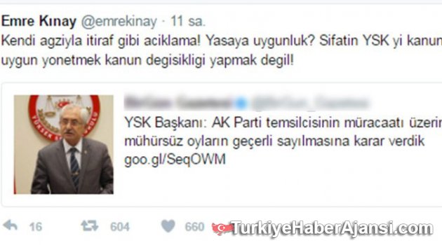 Oyuncu Emre Kınay, mühürsüz oy ve zarfları geçerli sayan YSK Başkanı Sadi Güven'e tepki gösterdi. Yüksek Seçim Kurulu Başkanı Sadi Güven, referandumun ilk sonuçlarını açıkladığı sırada; "Kesin olmayan sonuçlara göre, Evet ve Hayır oyu arasındaki fark 1 milyon 250 bin oldu.Halk oylamasında 'Evet' çıkmıştır. Kesin sonuçlar itirazlar değerlendirildikten sonra en geç 11, 12 gün sonra açıklanacaktır" demişti.CHP'nin 2,5 milyon şaibeli oy olduğunu iddia etti. YSK tarafından mühürsüz oyların geçerli sayılmasına tepki gösterilirken, Güven "Bazı sandıklarda Tercih mührü yerine Evet mührü dağıtıldı ve bunlarla oy kullanıldı. Evet mührünün seçmenin iradesini etkileyecek nitelikte görülmediğinden geçerli sayılmıştır" açıklamasıyla tartışmayı daha da alevlendirdi.Oyuncu Emre Kınay ise, YSK başkanının açıklamalarına sosyal medya hesabından tepki gösterdi: