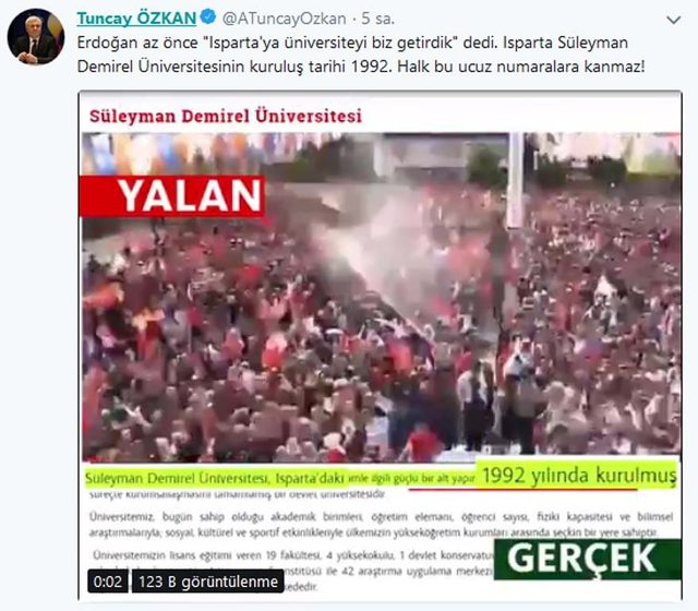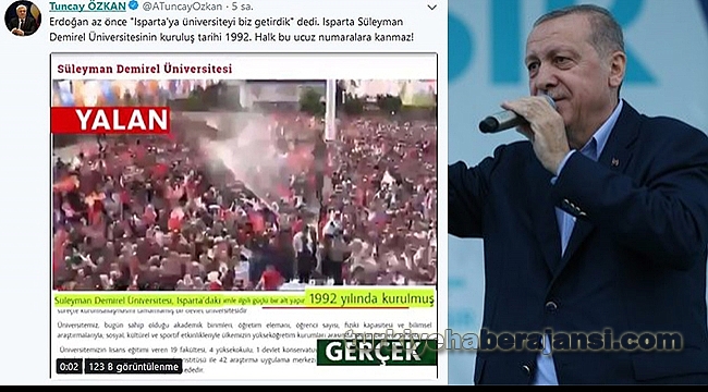Cumhurbaşkanı Tayyip Erdoğan, bugün Isparta'da konuştu. Erdoğan “Üniversiteyi Isparta’da kim kurdu? Biz kurduk” dedi. Ancak Isparta’da bulunan süleyman demirel Üniversitesi 1992 yılında Süleyman Demirel döneminde yapılmıştı.Erdoğan'ın bu konuşmasına dikkat çeken CHP Genel Başkan Yardımcısı Tuncay Özkan, “Erdoğan az önce ‘Isparta’ya üniversiteyi biz getirdik' dedi. Isparta Süleyman Demirel Üniversitesinin kuruluş tarihi 1992. Halk bu ucuz numaralara kanmaz!” paylaşımıyla tepki gösterdi.