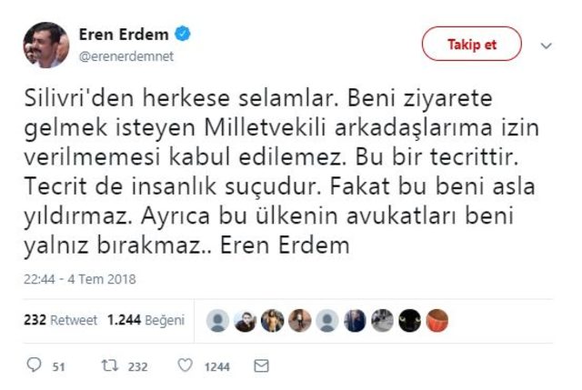 Eren Erdem sosyal medya hesabından yaptığı paylaşımda kendisini ziyarete gelmek isteyen milletvekillerine izin verilmemesine tepki gösterdi.İşte Erdem'in sosyal medya hesabından yayınladığı mesaj;Silivri'den herkese selamlar. Beni ziyarete gelmek isteyen Milletvekili arkadaşlarıma izin verilmemesi kabul edilemez. Bu bir tecrittir. Tecrit de insanlık suçudur. Fakat bu beni asla yıldırmaz. Ayrıca bu ülkenin avukatları beni yalnız bırakmaz...