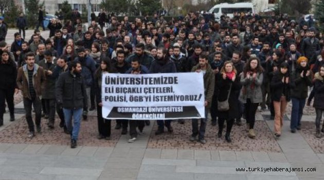 Eskişehir Osmangazi Üniversitesi'nde (ESOGÜ) yaklaşık 100 öğrenci 'Üniversitemizde eli bıçaklı çeteleri, polisi ve ÖGB'yi istemiyoruz' yazılı pankart açıp Rektörlük binasına yürüdü.ESOGÜ Meşelik Kampüsü'ndeki öğrenci kafeteryası önünde toplanan öğrenciler çeşitli sloganlar atarak Rektörlük binasına doğru yürüyüşe geçti. Polisin geniş güvenlik önlemi aldığı yürüyüş sonunda öğrenciler adına basın açıklamasını Gamze Şahinli okudu.Şahinli şunları söyledi:"Üniversitemiz haftalardır birçok saldırıyla karşı karşıya. Bilimi, bilimsel eğitimi savunan üniversite öğrencilerinin okula alınmadığı, ya da okuldan atıldığı bu günlerde, üniversite içerisinde polis ve eli sopalı çeteler yan yana beklemekte. Artık bolca maruz kaldığımız bu saldırı, çevik ablukası ve özel güvenlik görevlilerinin tacizi katlanılamaz bir hal almıştır. Bizler artık bu görüntülere tanık olmak istemiyoruz. Okulumuzda can güvenliğinin ve öğrenim özgürlüğünün olmadığı bu dönemde, bir kişi bile zarar görmeden bu saldırıların son bulmasını istiyoruz."Rektörlük önündeki basın açıklamasının ardından öğrenciler bir süre halay çekip oynadıktan sonra dağıldı.