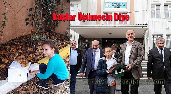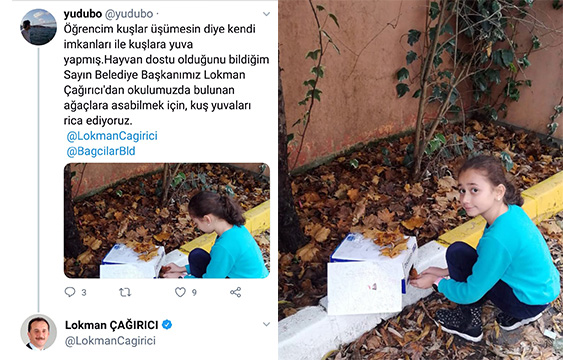 Soğuk havalarda kuşlar üşümesin diye kartondan yuva yapıp sosyal medyada paylaşan 8 yaşındaki eyşan Nisa Başar’ın çağrısı karşılıksız kalmadı. Bağcılar Belediye Başkanı Lokman Çağırıcı, ahşaptan yaptırdığı kuş yuvasını Eyşan’a hediye etti ve onunla birlikte okul bahçesindeki ağaca yerleştirdi.