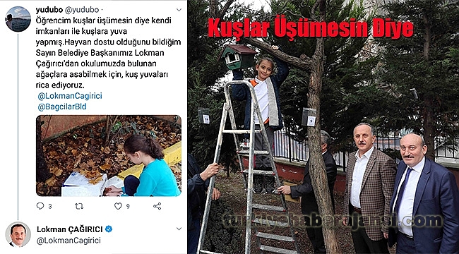 “Fotoğrafını görünce çok etkilendim”Eyşan’ın çağrısını bağcılar belediye başkanı Lokman Çağırıcı duydu. Başkan Çağırıcı, bir gün sonra minik Eyşan’a okulda sürpriz yaptı. Yanında götürdüğü ahşap kuş yuvasını Eyşan’a hediye eden Çağırıcı, “Minik yüreğiyle kuşları düşünerek böyle bir girişimde bulunan Eyşan’ı tebrik ediyorum. Fotoğrafını görünce çok etkilendim. Kızımız bu yaptığıyla insanlar kadar diğer canlıların da hayatımızda yeri olduğunu, onları da düşünmemiz gerektiğini bize bir kez daha hatırlattı. Kendisinin bu hareketi herkese örnek olsun” dedi.