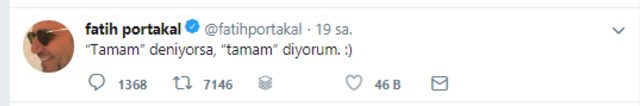 Cumhurbaşkanı Erdoğan'ın sözleri sonrası sosyal medyada 'tamam' rüsgarı esti. 'T A M A M' hashtagi dünya ve Türkiye gündeminde TT olarak 1. sıraya yerleşti. 'T A M A M' hashtagi ile dünden bu yana yaklaşık 2 milyon tweet atıldı.FOX TV Ana Haber suncusu fatih portakal da sosyal medyadaki 'tamam' mesajlarına destek veren isimlerden oldu.Portakal paylaşımında "'Tamam' deniyorsa, 'tamam' diyorum. :)" ifadelerini kullandı.