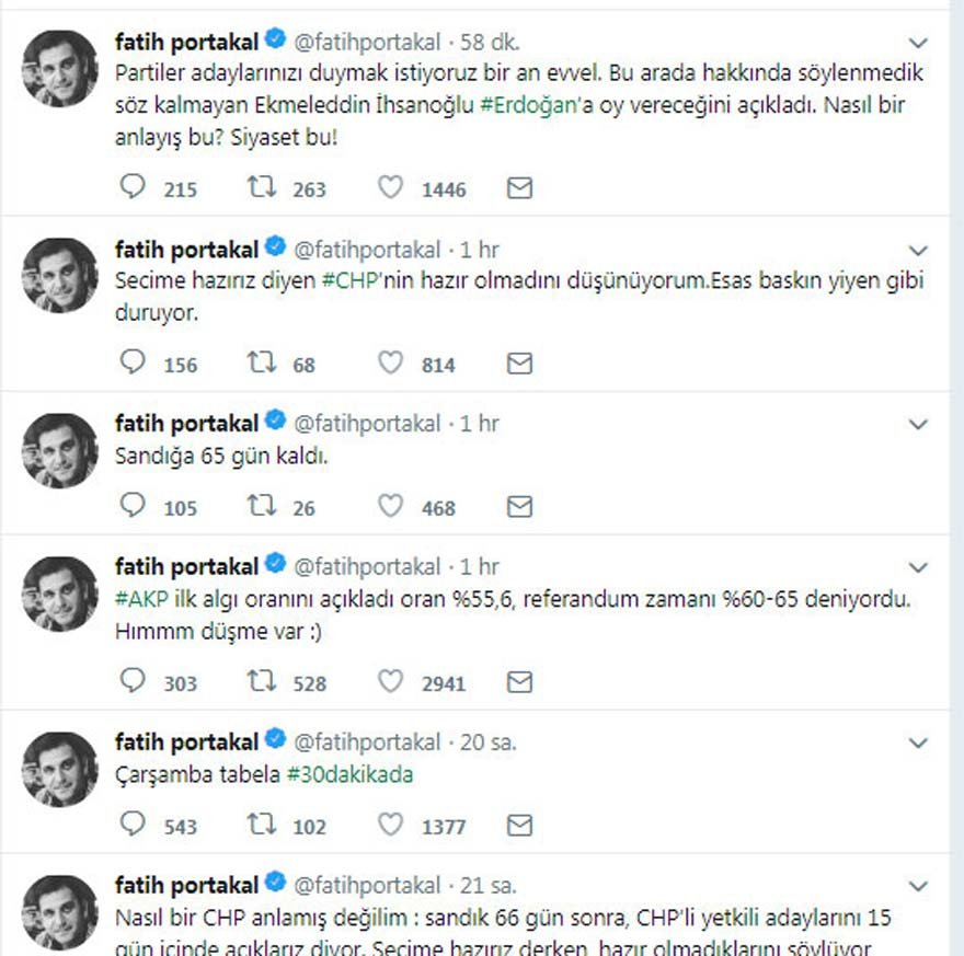 Fatih Portakal’ın sosyal medyadan yaptığı paylaşımlar şöyle; “32 saattir yaşananlara bakıyorum iddiam şu: bir senaryo uygulanmış gibi geliyor. AKP VE MHP'nin kurmayları önceden buna karar vermişler. Açıklama mhp liderine düşmüş. Tam anlamıyla baskın seçim! seçim tarihi: 24 Haziran 2018 pazar günü.Portakal, CHP’nin “Biz hazırız” açıklaması hakkında da “Nasıl bir chp anlamış değilim : sandık 66 gün sonra, CHP'li yetkili adaylarını 15 gün içinde açıklarız diyor. Seçime hazırız derken, hazır olmadıklarını söylüyor aslında” diye yazdı.