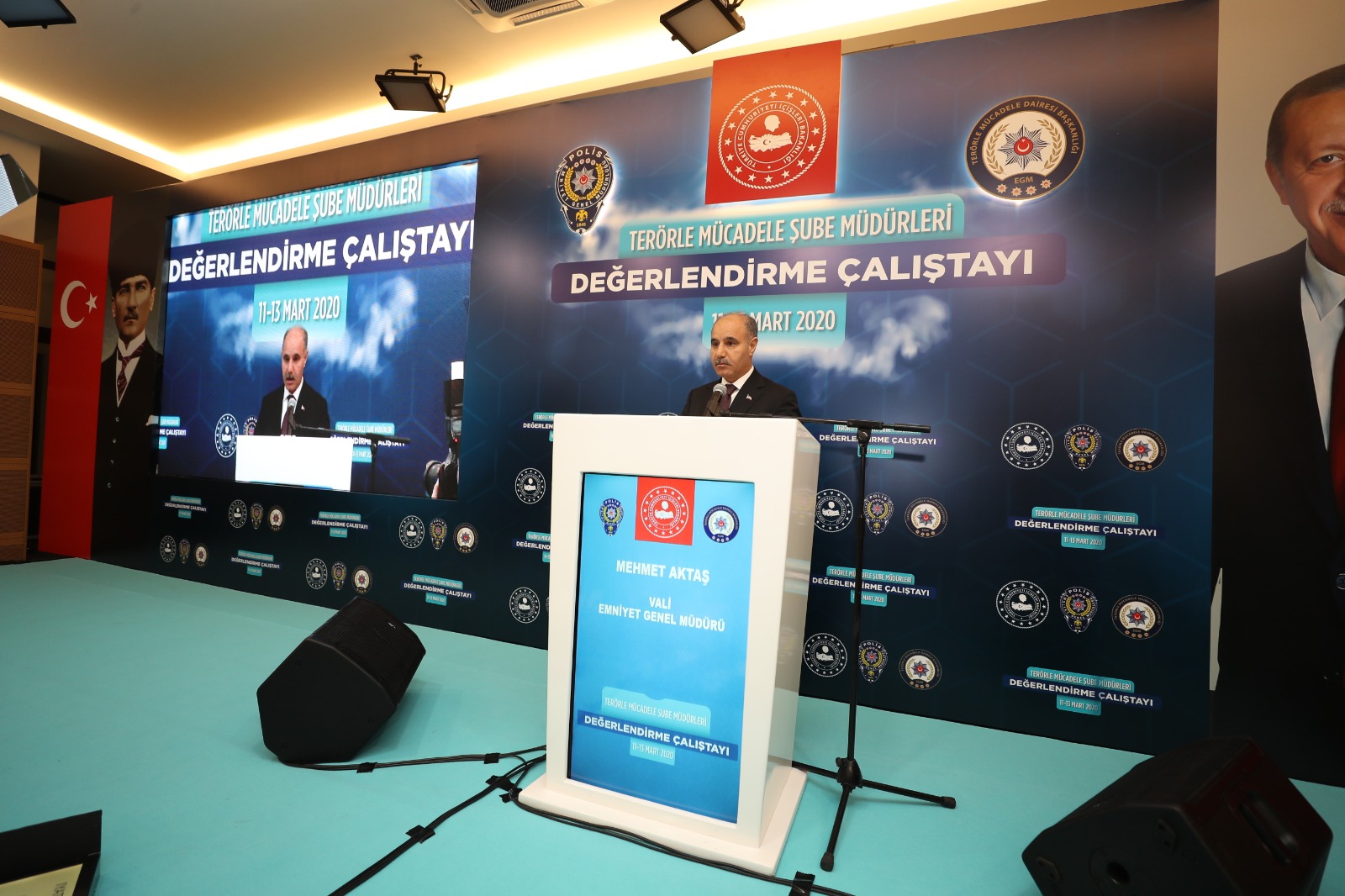 Emniyet Genel Müdürü Mehmet Aktaş, 81 İl Terörle Mücadele Şube Müdürleri Değerlendirme Çalıştayı’nda yaptığı konuşmasına “Tüm dünyayı ilgilendiren ve nihai amacı yıkım ve yıldırma olan terörü, ortaya koyduğumuz yüksek irade ve kararlı mücadele sayesinde her alanda geriletmeye devam ediyoruz. Verdiğimiz bu amansız mücadele sayesinde, pkk, fetö, deaş, dhkp-c ve diğer tüm terör örgütlerinin hareket alanlarını iyice daraltırken, finans kaynaklarına da büyük darbeler indiriyoruz. Huzur ve güvenliğimizin tesisi, birlik ve beraberliğimizin korunması ve ülkemizin bekası noktasında verdiğimiz bu başarılı mücadele ve kat ettiğimiz mesafeden ötürü teşkilat mensubu tüm mesai arkadaşlarıma en derin şükranlarımı sunuyorum.” şeklinde başladı.Mehmet Aktaş, “Sadece ülkemizin birlik ve beraberliğine değil, kalkınması, gelişmesi ve büyümesine de düşman olan, evlatları annelerinden koparan ve insanımızı acımasızca katleden PKK terörü ile mücadelemiz, diğer güvenlik birimlerimiz ile birlikte kesintisiz bir şekilde devam etmektedir.” dedi.Aktaş, “Gerek etkisiz hale getirilen terörist sayısı, gerek ele geçirilen silah ve mühimmat sayısı, gerek düzenlediğimiz operasyon sayısı, gerekse örgütten kaçarak teslim olan terörist sayısındaki artış; pkk ile mücadelede, geldiğimiz en iyi noktada olduğumuzun en temel göstergesidir. Öte yandan DEAŞ terör örgütüne karşı düzenlediğimiz başarılı operasyonlarla da bu örgüte katılımlar ve çatışma bölgelerine geçişler azalmış, örgüt, ülkemizde hiçbir eylem gerçekleştiremez hale gelmiştir.” şeklinde sözlerini sürdürdü.Aktaş, “Sinsi bir yapılanma ile devlete sızmış ve 15 Temmuz’da hain bir darbeye kalkışmış FETÖ/PDY terör örgütüne karşı da amansız mücadelemiz devam etmekte, devletin kurumlarından ve diğer tüm kurumlardan militanlarını temizleme noktasında da çalışmalarımız sürmektedir. DHKP-C gibi sol terör örgütleri ve ülkemizi hedef alan tüm terör gruplarına karşı insanüstü bir gayret ve bütüncül bir anlayışla mücadelemizi, terörü kaynağından yok etme, terör örgütlerini faaliyet yürüttüğü her alanda etkisiz hale getirme stratejileri çerçevesinde sürdürmekteyiz.” şeklinde sözlerini tamamladı. ÖZEL HABER-** Halis KAHRAMAN ** (Türkiye Haber Ajansı )