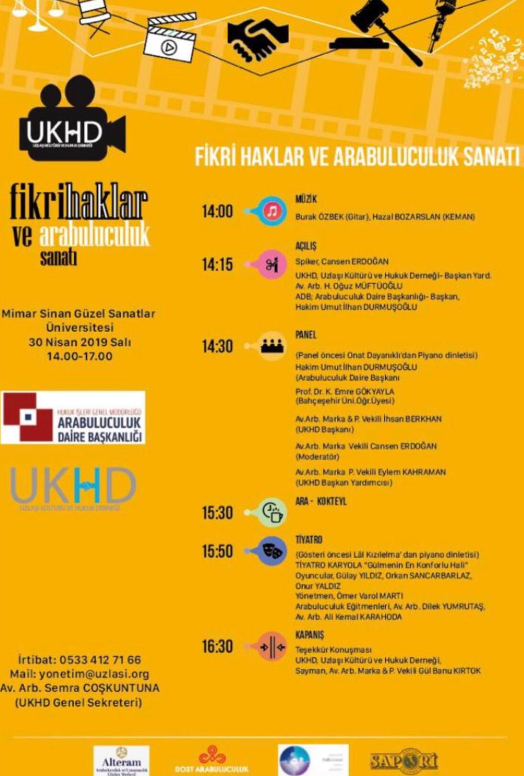 Uzlaşı Kültürü ve Hukuk Derneği (UKHD) organizasyonu, Adalet Bakanlığı Arabuluculuk Daire Başkanlığı (ADB) desteği ile “Fikri Haklar ve Arabuluculuk Sanatı” paneli düzenleniyor. 30 Nisan 2019 tarihinde Mimar Sinan Güzel Sanatlar Üniversitesi’nde düzenlenecek panelin moderatörlüğünü, Türkiye Haber Ajansı Köşe Yazarı, Gazeteci, Arabulucu, av. cansen erdoğan yapacak.Panelde; 01.01.2019 tarihinde Türk Ticaret Kanununda yapılan değişiklik ile yürürlüğe giren yeni düzenlemelerle, Fikri Haklarla ilgili bazı anlaşmazlıklar için dava açılmadan önce arabulucuya başvurulmasının zorunlu hale gelmesi noktasından hareketle “Arabuluculuk” a ilişkin yeni düzenlemeler konuşulacak.Tiyatral anlatımlar ve müzik dinletilerinin yer alacağı panelde, Arabuluculuk Daire Başkanı Hâkim Umut İlhan Durmuşoğlu konuşmacı olarak yer alacak.Panel öncesinde Gitarist Burak Özbek ve Kemani Hazel Bozarslan tarafından müzik dinletisi sunulacak.PANEL KİMLİĞİ