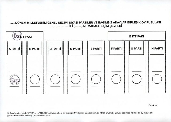 İttifak alanı içerisinde mührün hem bir siyasi partiye ayrılan alana hem de ittifak unvanı bölümüne basılması halinde bu oy pusulaları geçerli kabul edilecek ve bu oy mühür basılan partiye sayılacak.