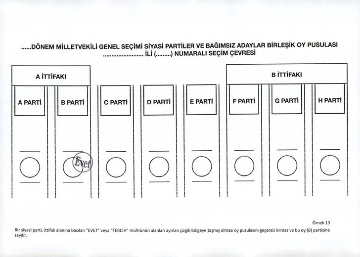 Bir siyasi parti, ittifak alanına basılan "EVET" veya "TERCİH" mührünün alanları ayrılan çizgili bölgeye taşmış olması halinde oy pusulası geçerli kabul edilecek ve oy mühür basılan partiye sayılacak.