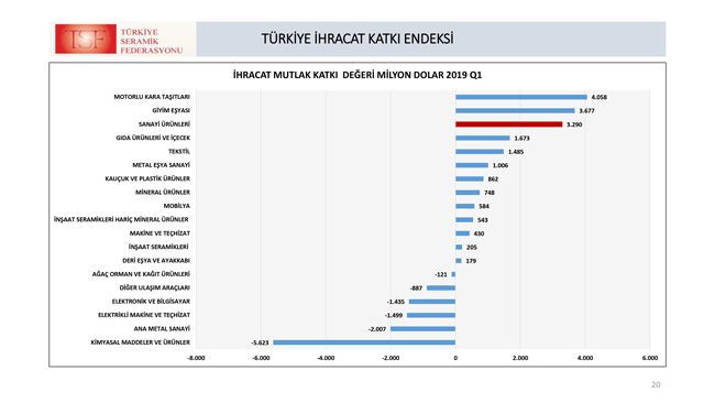 TSF (Türkiye Seramik Federasyonu) tarafından hazırlanan ve Türkiye’de sanayi sektörlerinin ihracata katkısını ölçen Türkiye İhracat Katkı Endeksinin 2019 yılı birinci çeyrek sonuçları açıklandı.