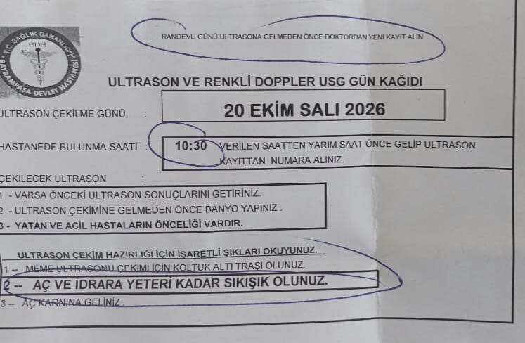 "Ultrason için tam 6 ay 20 gün sonrasına, 20 Ekim 2026 tarihine randevu verildi "Randevu kağıdını eline aldığında şaşkınlığını gizleyemeyen Kahraman, duruma sert tepki göstererek, “Sözde sağlıkta çağ atladık. Yahu 6 ay sonraya hasta mı kalır, hastalık mı kalır? ? Devlet hastanelerinde görüntüleme randevularının 3–6 aydan 9 aya çıktığını hastalardan öğrendim.Sağlık hizmetlerinde yaşanan bu sorunun ortadan kaldırılması için devlet hastanelerinde görüntüleme merkezlerinin günlük mesai saatleri dışında ve hafta sonları da hasta vatandaşlara neden hizmet verilmesi sağlanmaz..?” ifadelerini kullandı.