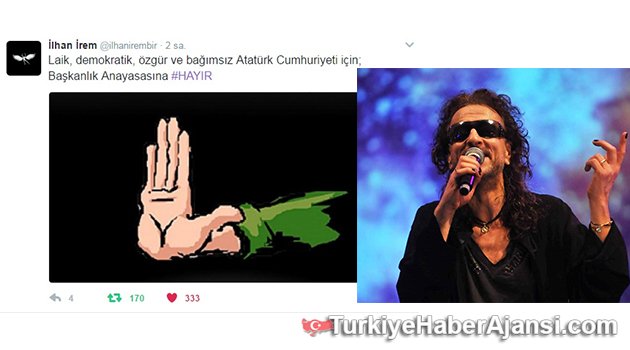 Türk Pop Müziği'nin efsane sanatçısı İlhan İrem, sosyal medyada referandumda "Hayır" diyeceğini açıkladı.Sanatçı İlhan İrem, Twitter da yaptığı açıklamada; referandumda Başkanlık Anayasasına "Hayır" diyeceğini yazdı.İlhan İrem Twitter'dan yaptığı açıklamada, "Laik, demokratik, özgür ve bağımsız Atatürk Cumhuriyeti için; Başkanlık Anayasasına #HAYIR " ifadelerini kullandı.Sanatçı İlhan İrem 17 yıl önce FETÖ’nün kurucusu Fethullah Gülen’e ‘Fetuş’ dediği için eski parayla 1 milyar TL tazminat ödemişti.