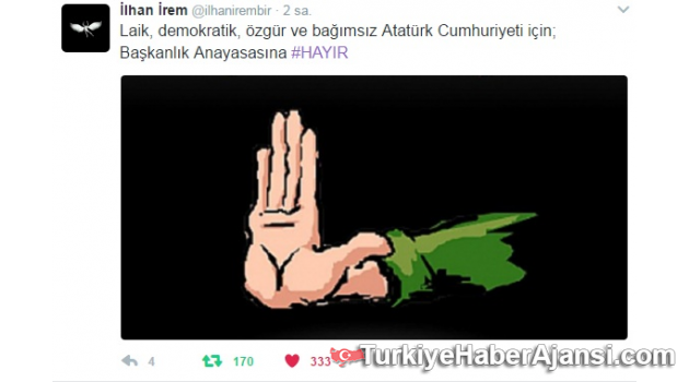 İlhan İrem, "bağımsız Atatürk Cumhuriyeti için; Başkanlık Anayasasına #HAYIR" dediğini açıkladı. İrem, FETÖ’nün kurucusu Fethullah Gülen’e ‘Fetuş’ dediği için eski parayla 1 milyar TL tazminat ödemişti...