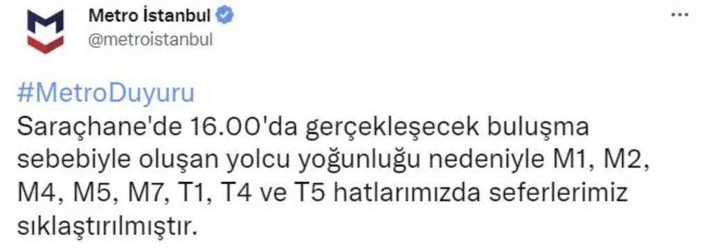 Metro İstanbul'un sosyal medya hesabından yapılan açıklamada, "Saraçhane'de 16.00'da gerçekleşecek buluşma sebebiyle oluşan yolcu yoğunluğu nedeniyle M1, M2, M4, M5, M7, T1, T4 ve T5 hatlarımızda seferlerimiz sıklaştırılmıştır." Denildi.
