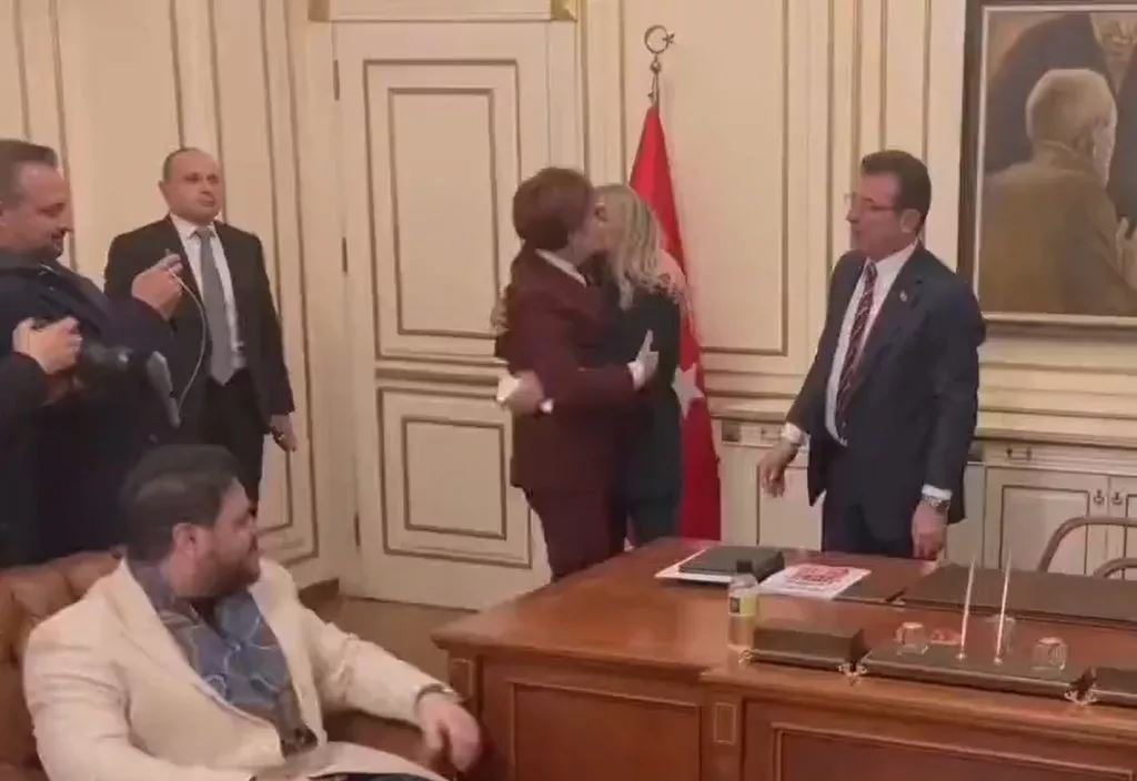 Bu sırada Meral Akşener ile Dilek İmamoğlu'nun sarıldığı görüldü.